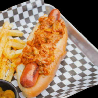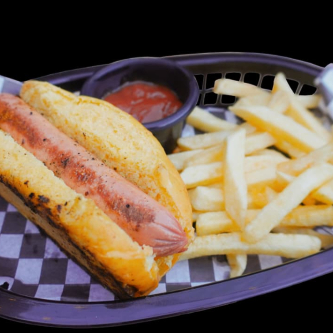 Hot dog clásico con salchicha y papas, al estilo infantil.