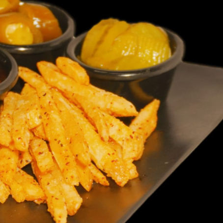 Crujientes papas fritas con un toque especial de especias, acompañadas de catsup.