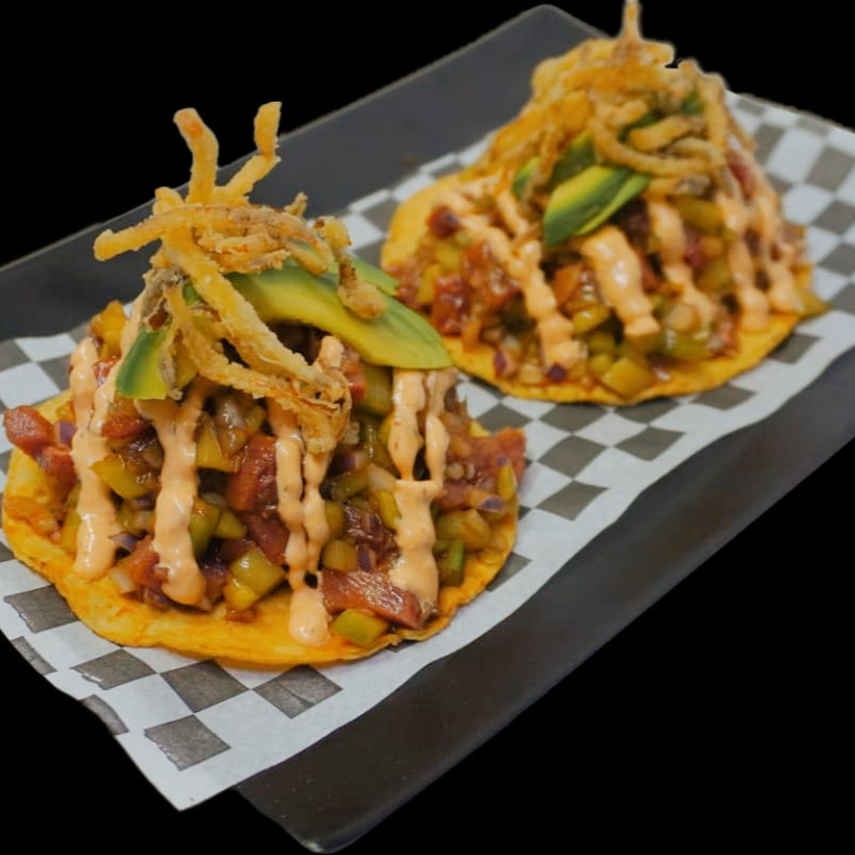 Dos tostadas de ceviche de medallón de atún con cebolla crispy.