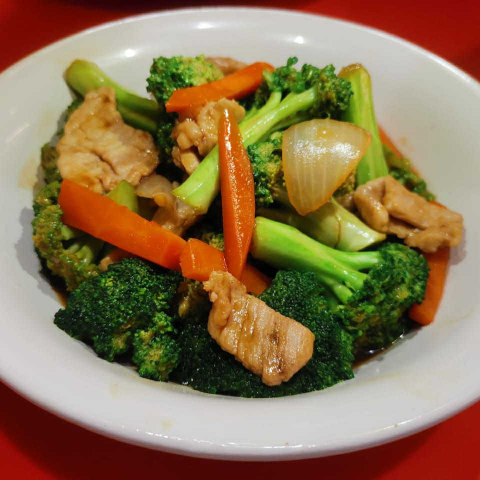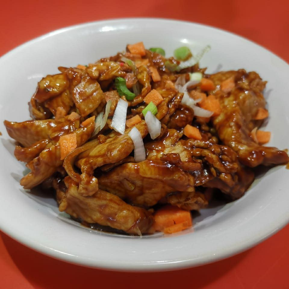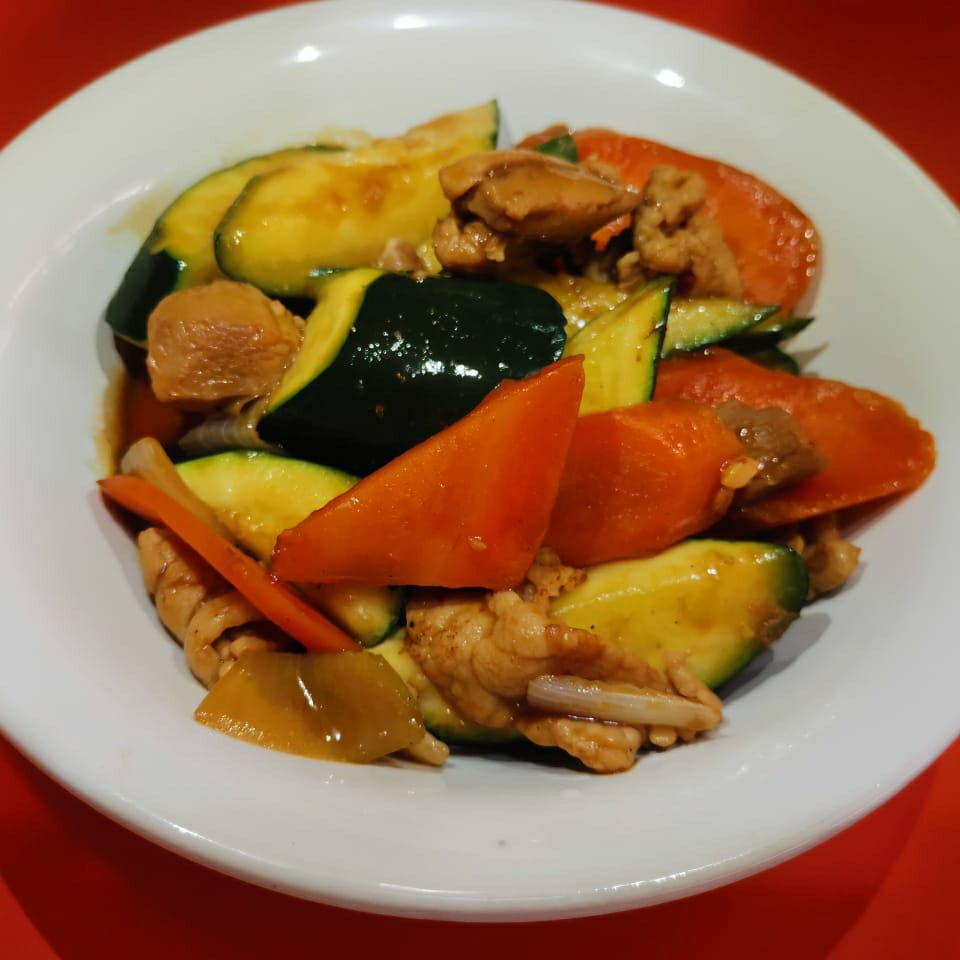 carne de puerco con salsas orientales, cebolla, chayote y zanahoria