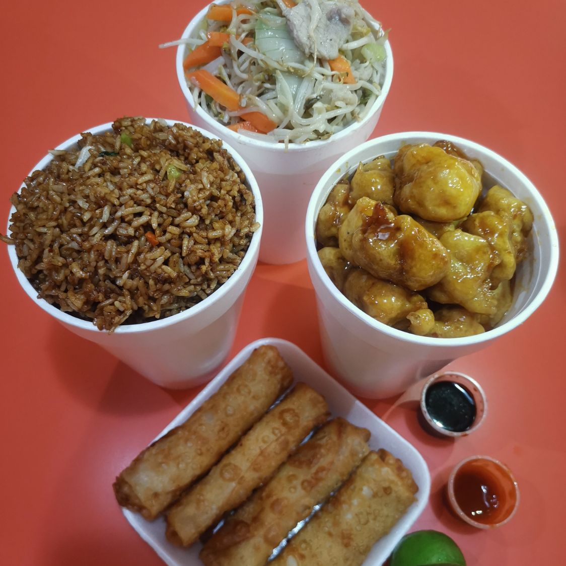 1 litro arroz // 1 litro de chop suey // 1 litro de guiso a escoger // 4 rollos