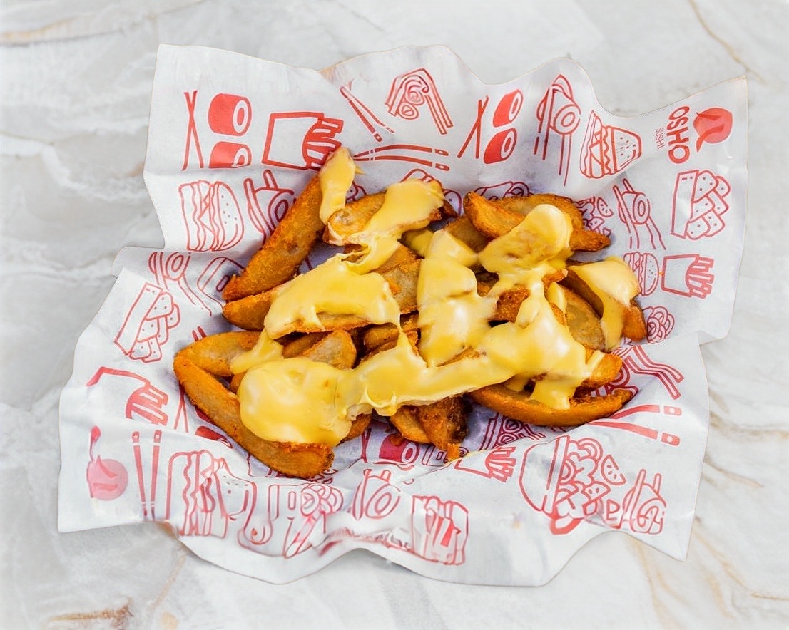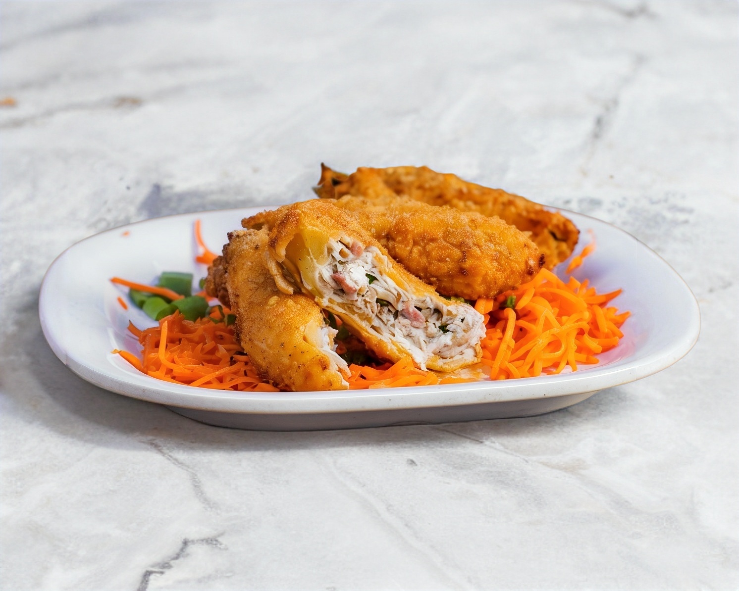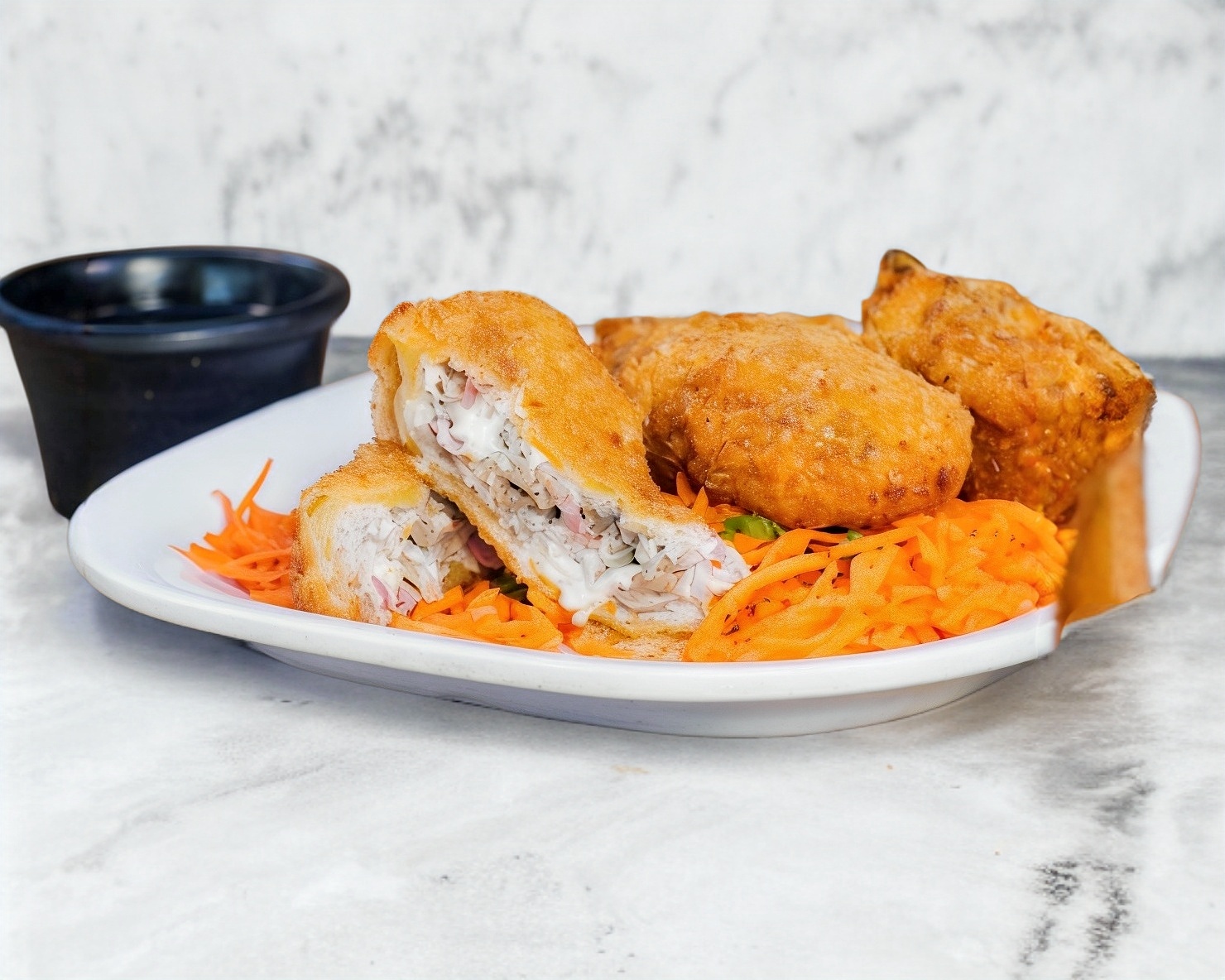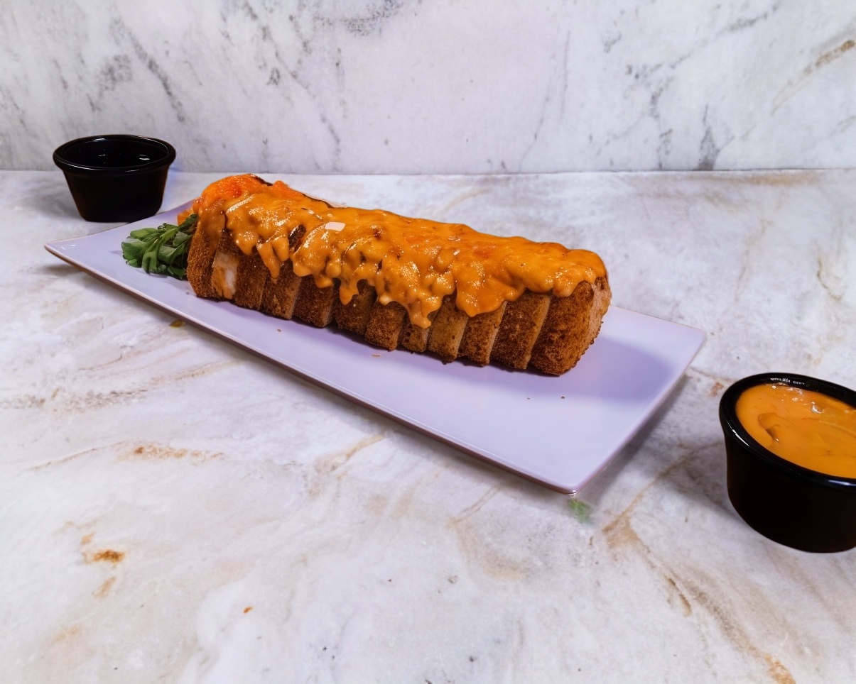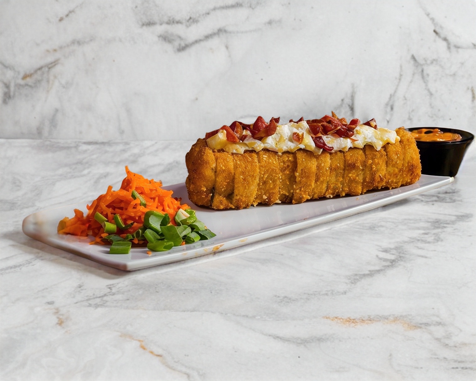 Arroz con queso crema, pollo, tocino y aguacate, cubierto con queso gratinado y empanizado