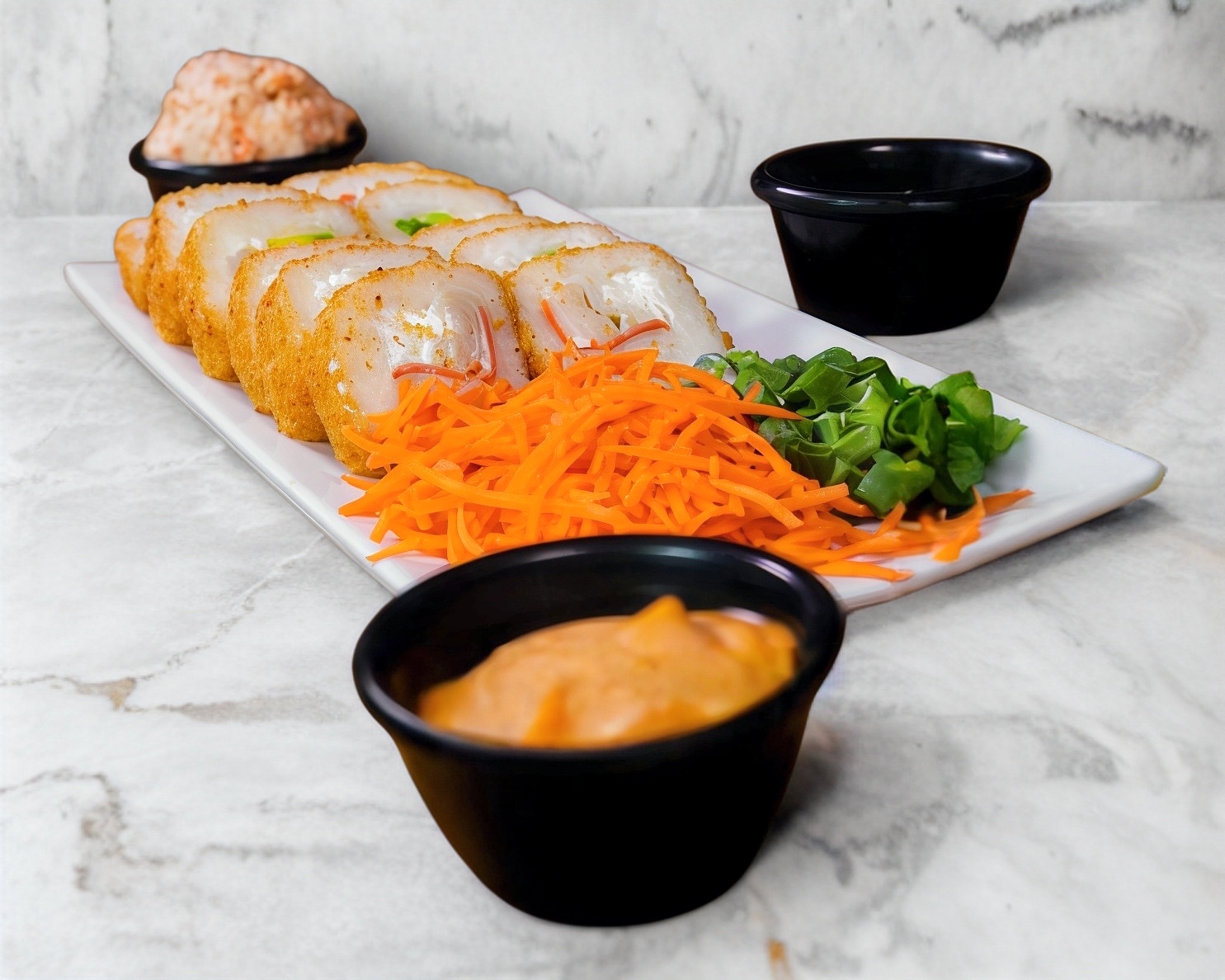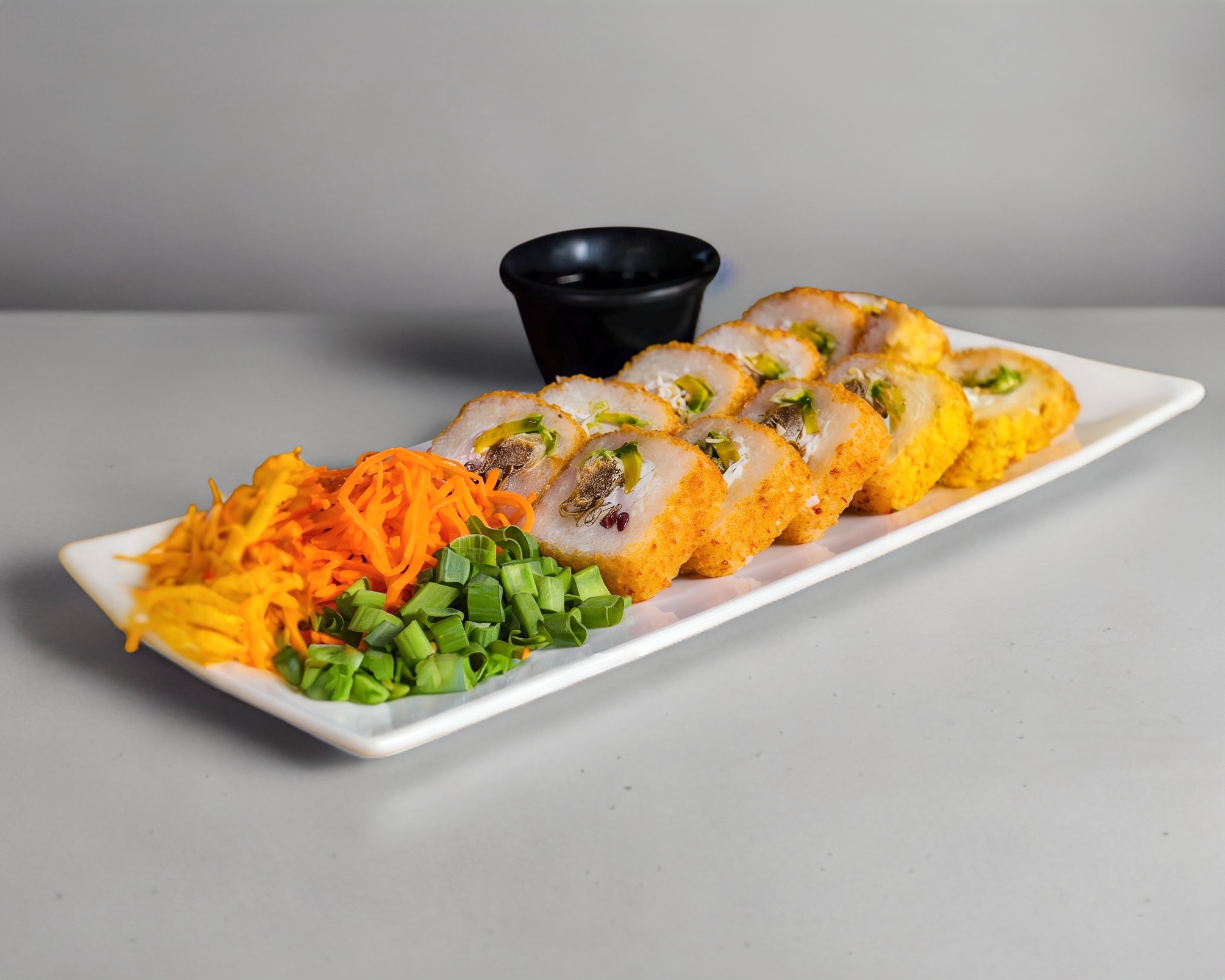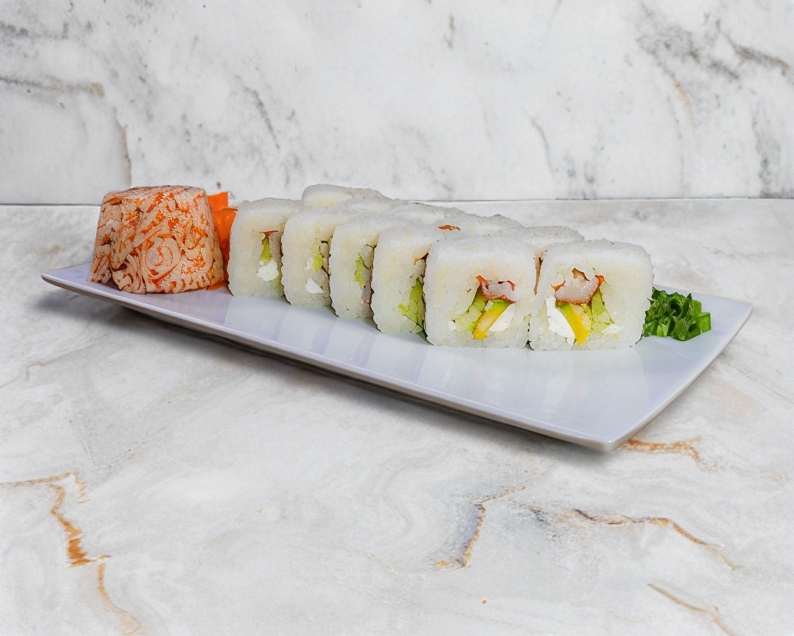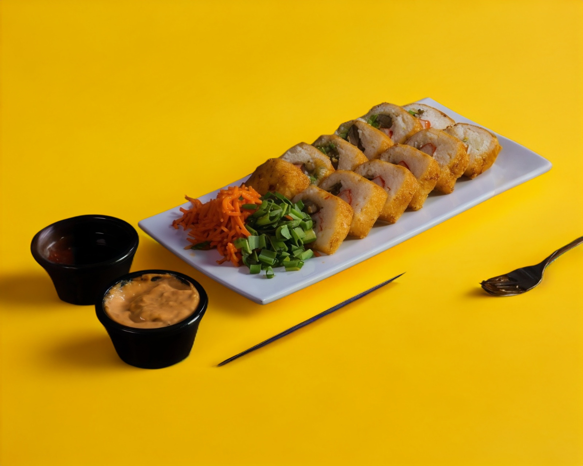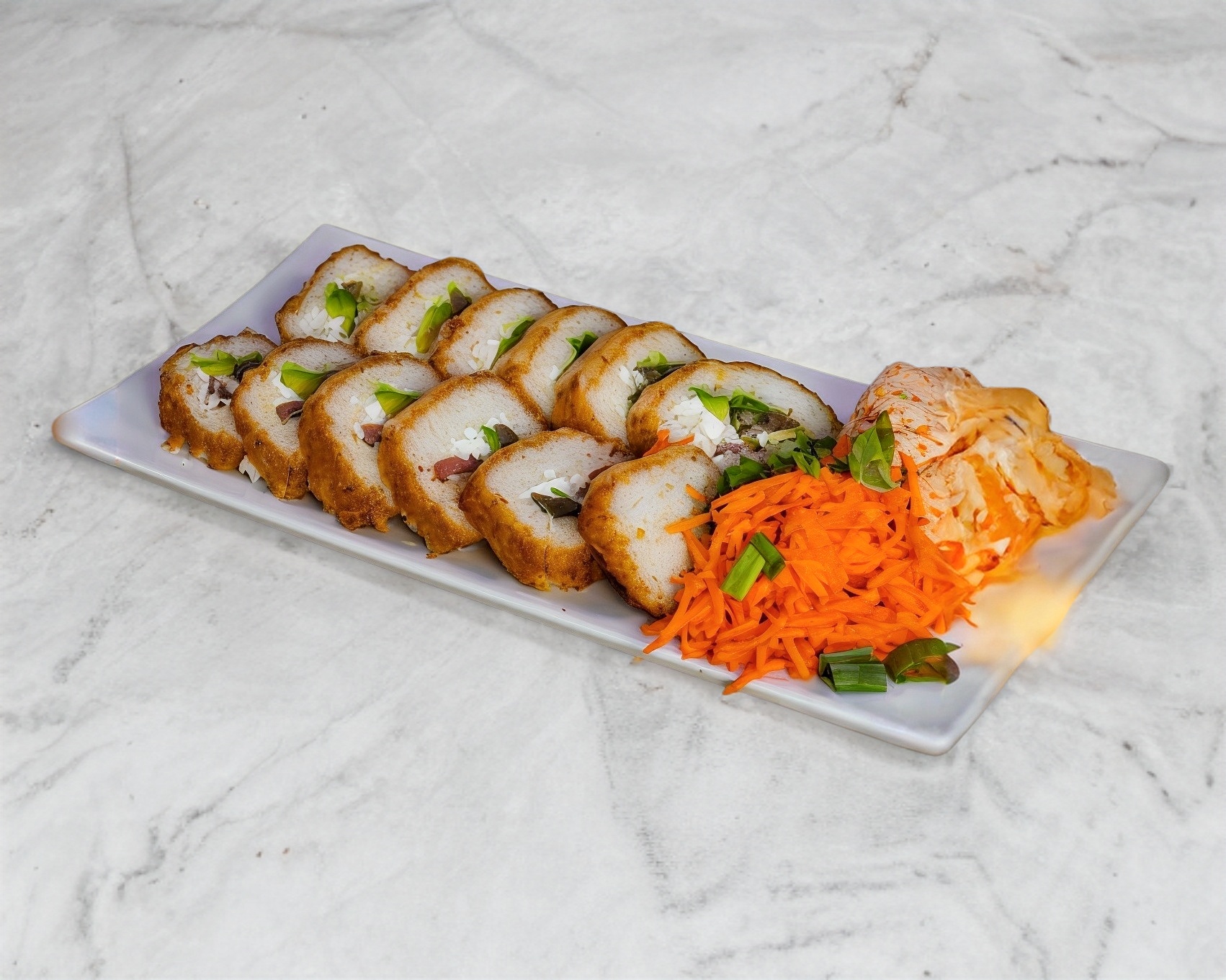 Rollo con arroz, queso crema, aguacate, res y surimi, empanizado