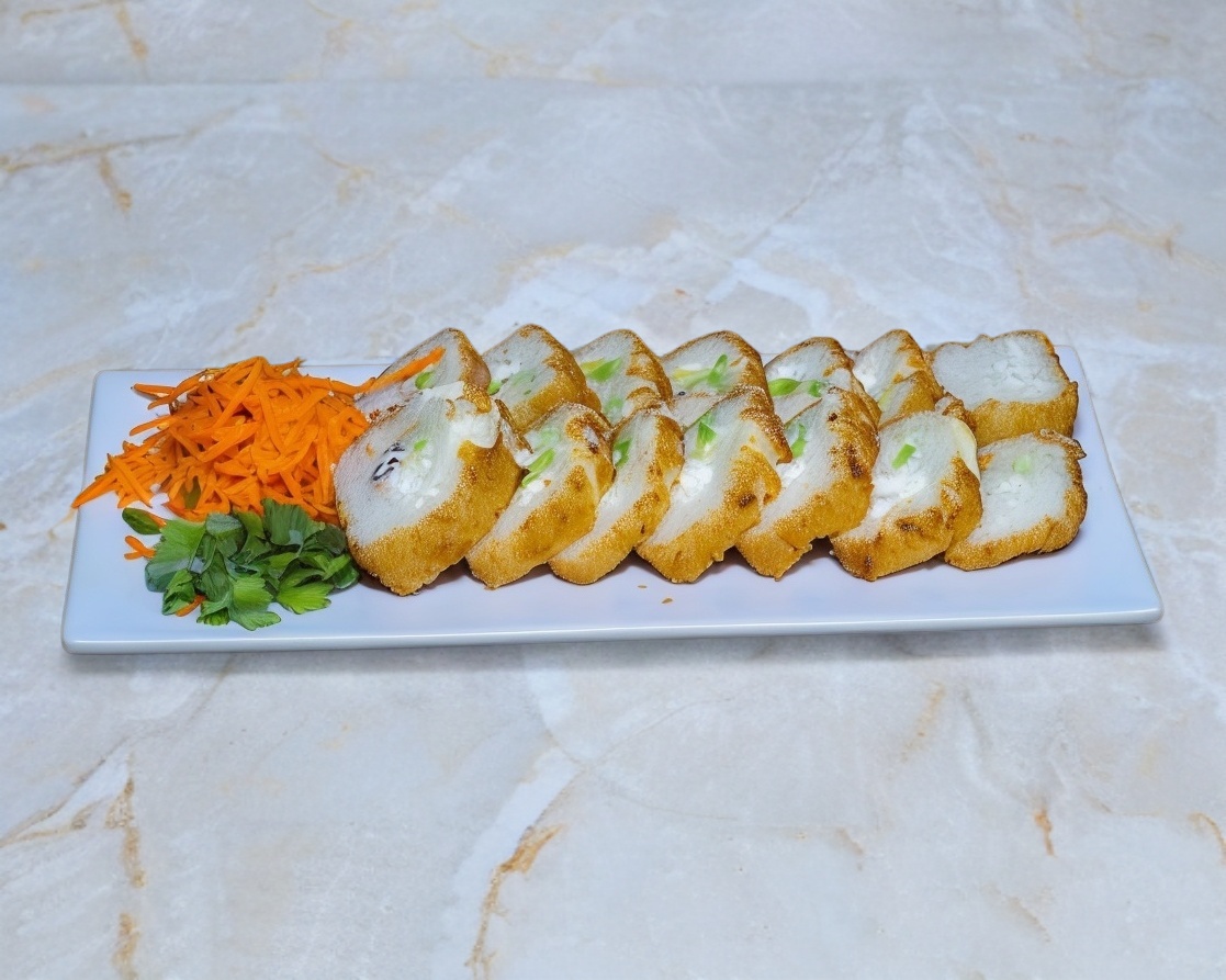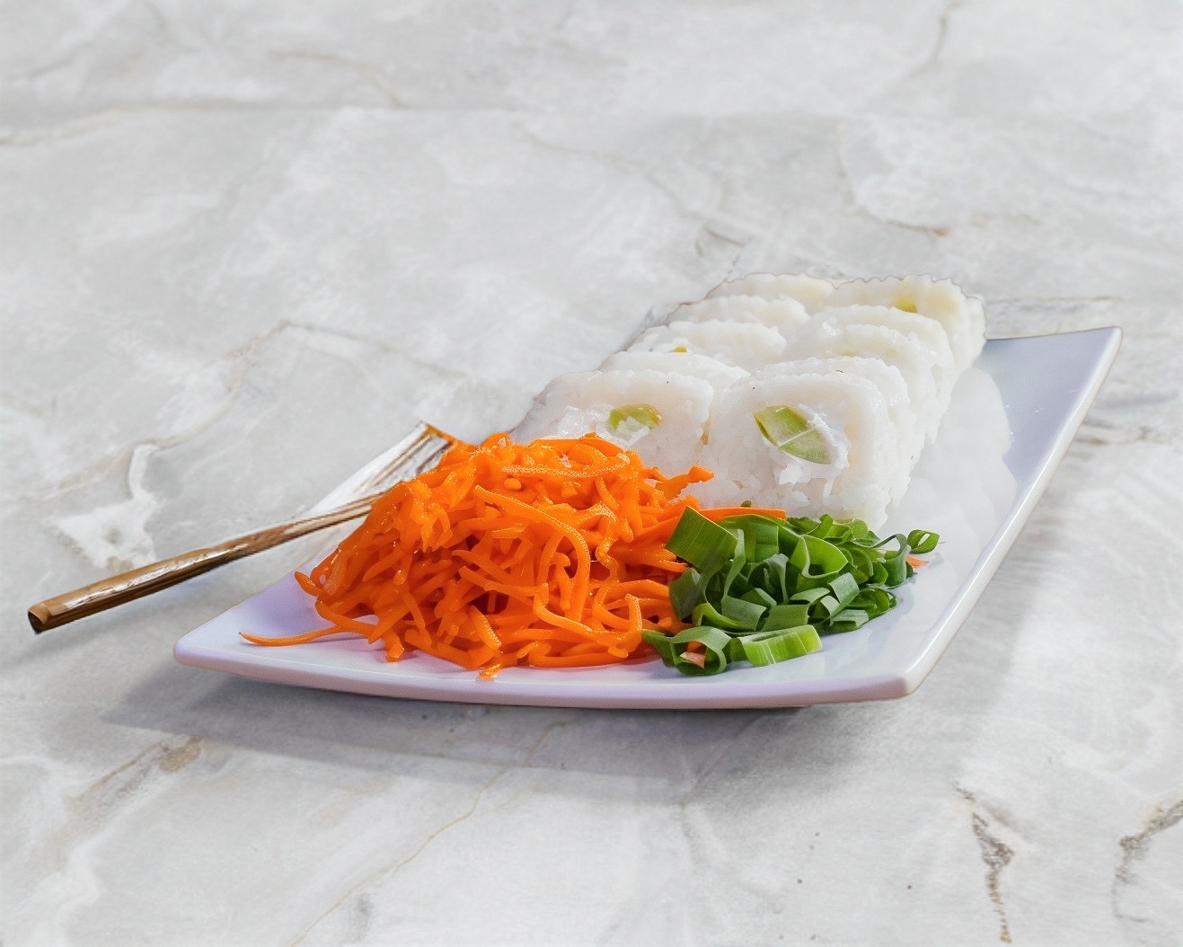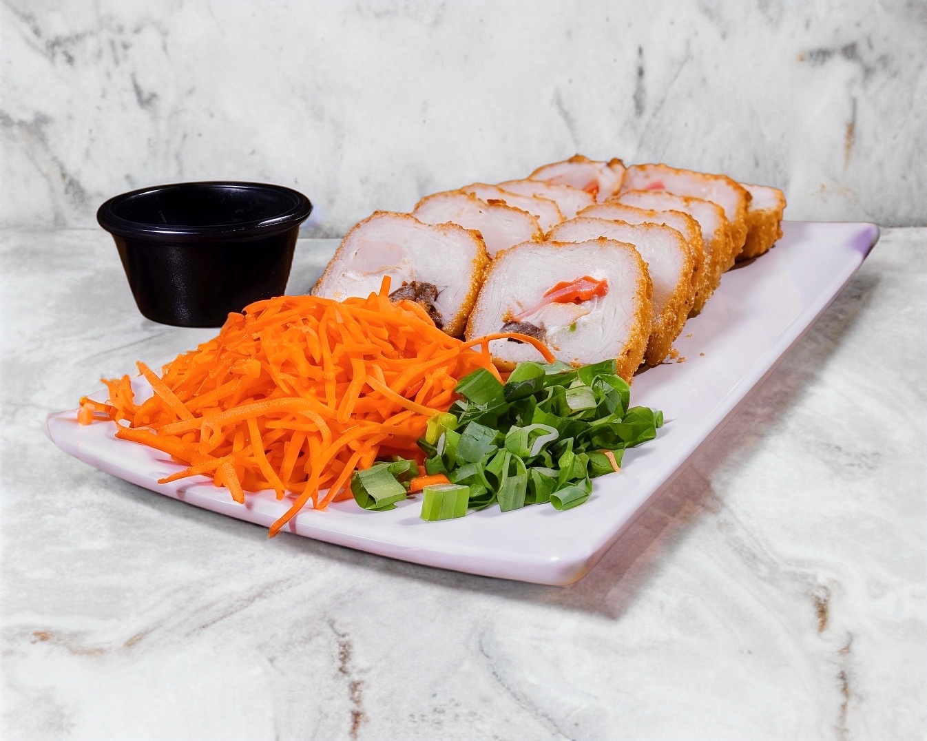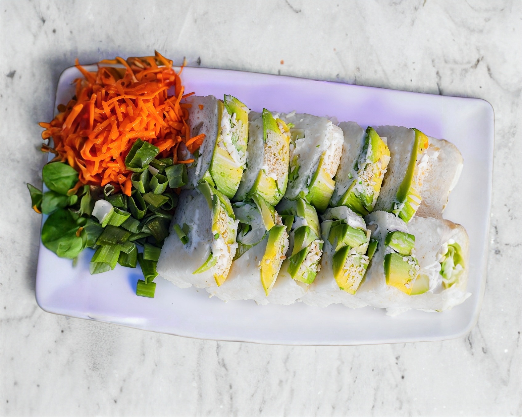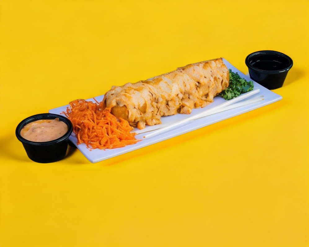 Rollo con arroz, queso crema, aguacate, res y surimi, empanizado