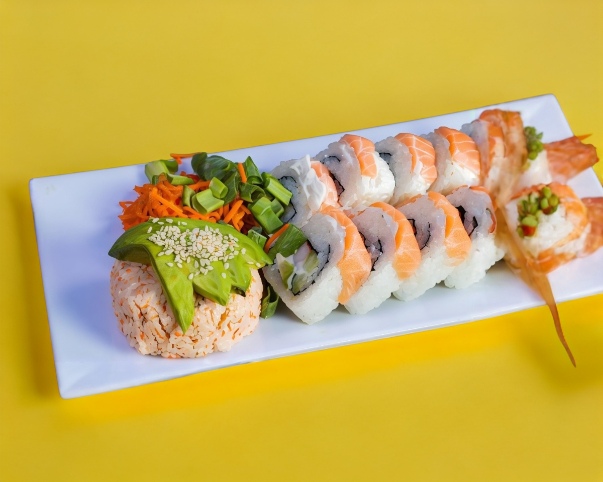 Arroz con queso crema, aguacate, pepino y surimi, cubierto con salmón por fuera.