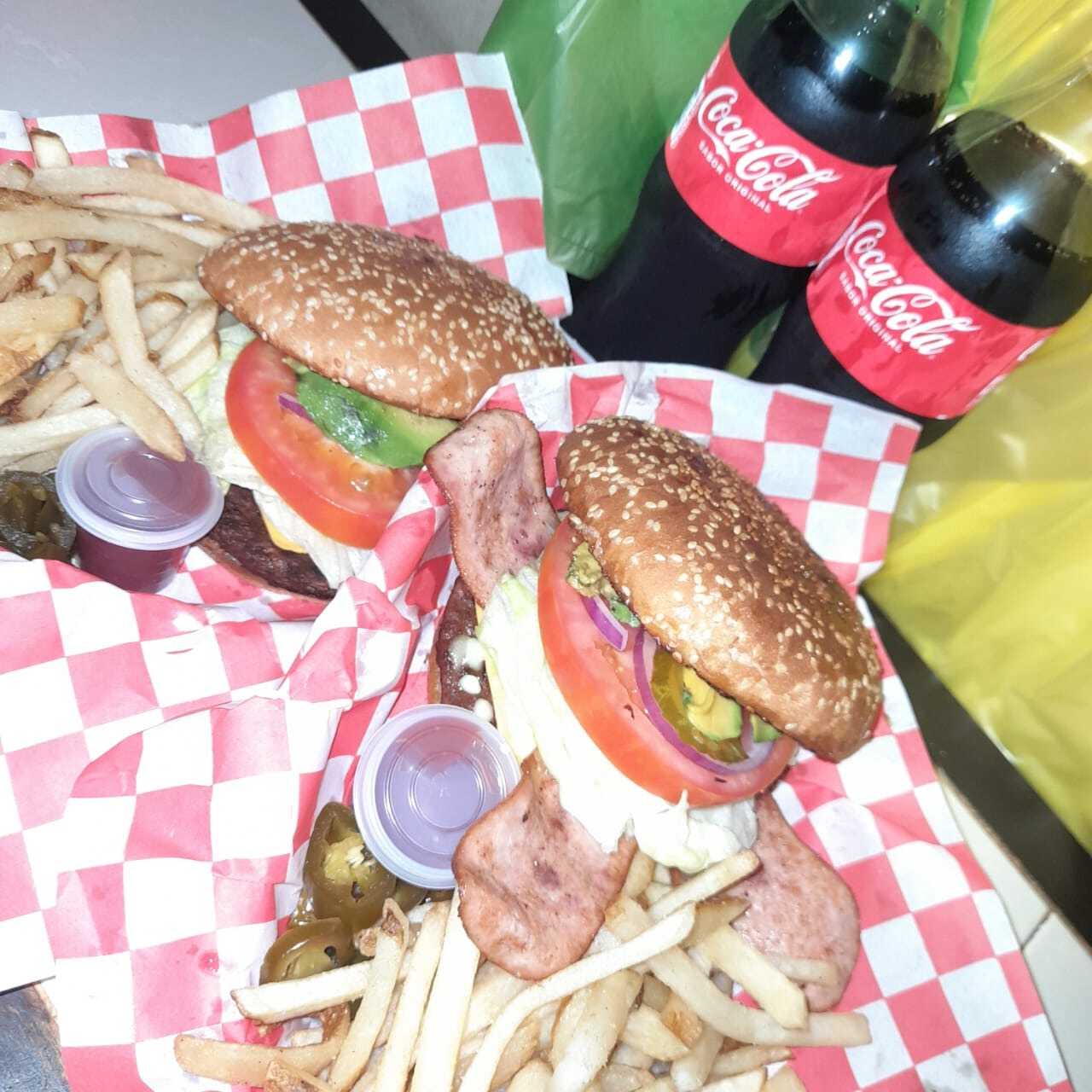 Hamburguesa 1 carne, queso amarillo, queso asadero, tocino, lechuga tomate cebolla pepinillos y aguacate, acompañada con papas