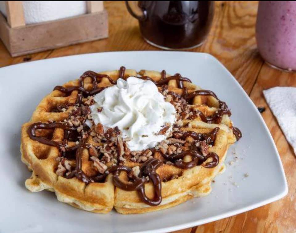 Sándwich de waffle clásico con queso gratinado, tocino, y pollo frito, acompañado de papas.