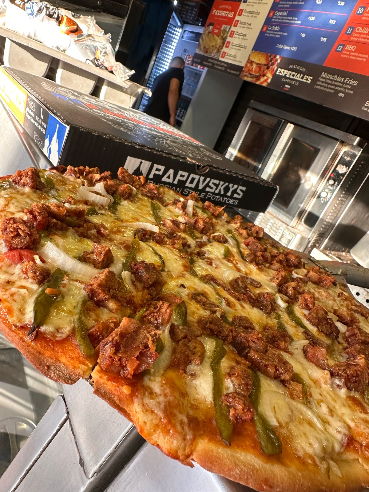 Carne, champiñones, queso chihuahua (mucho), pepperoni y tocino. Incluye papas fritas.