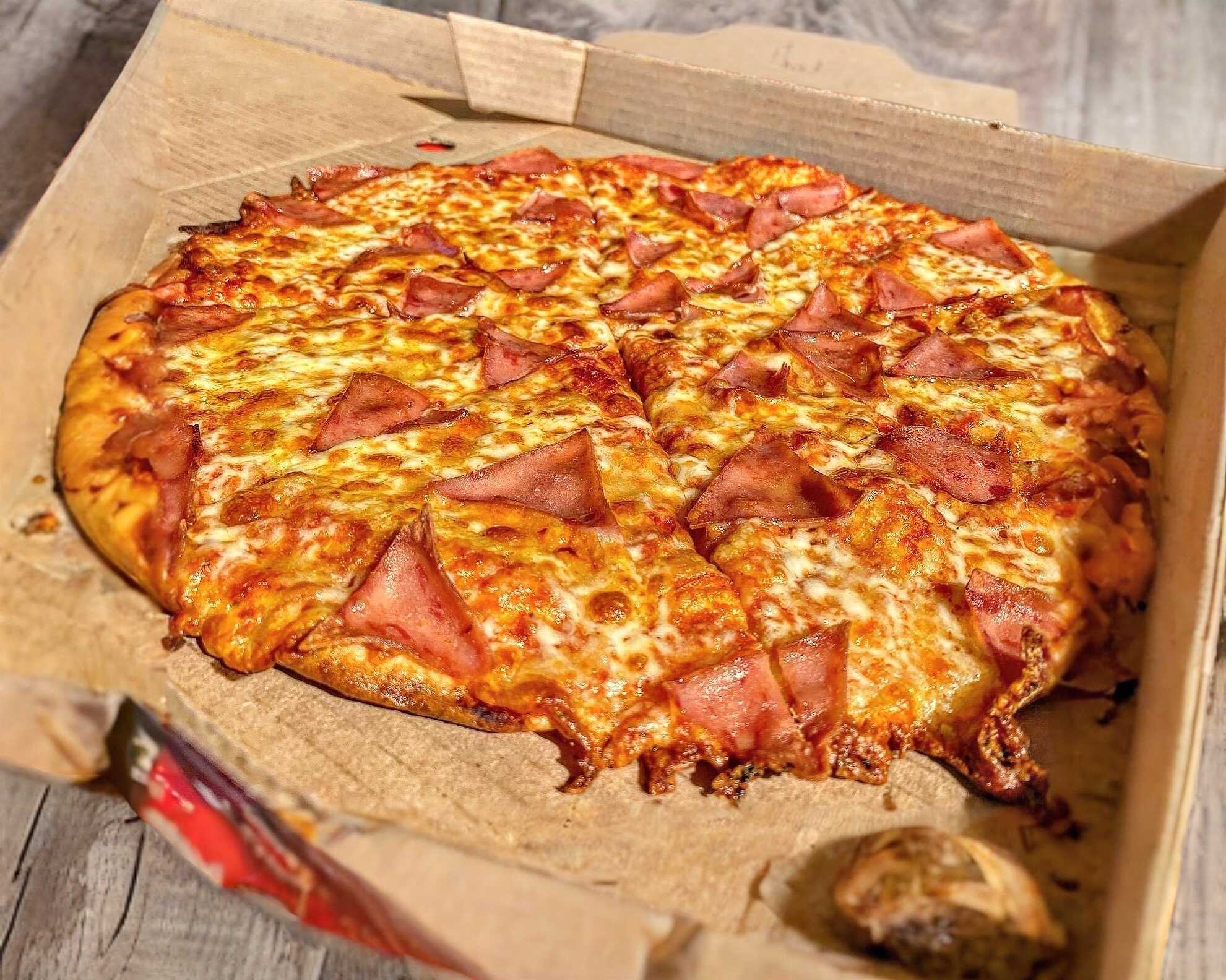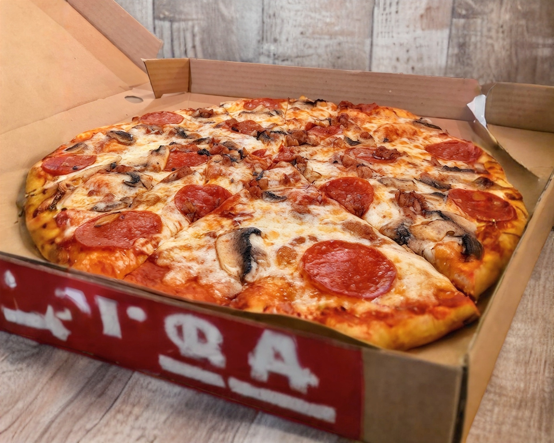 Lleva pepperoni, tocino y champiñones. Hecha en una masa delgadita.