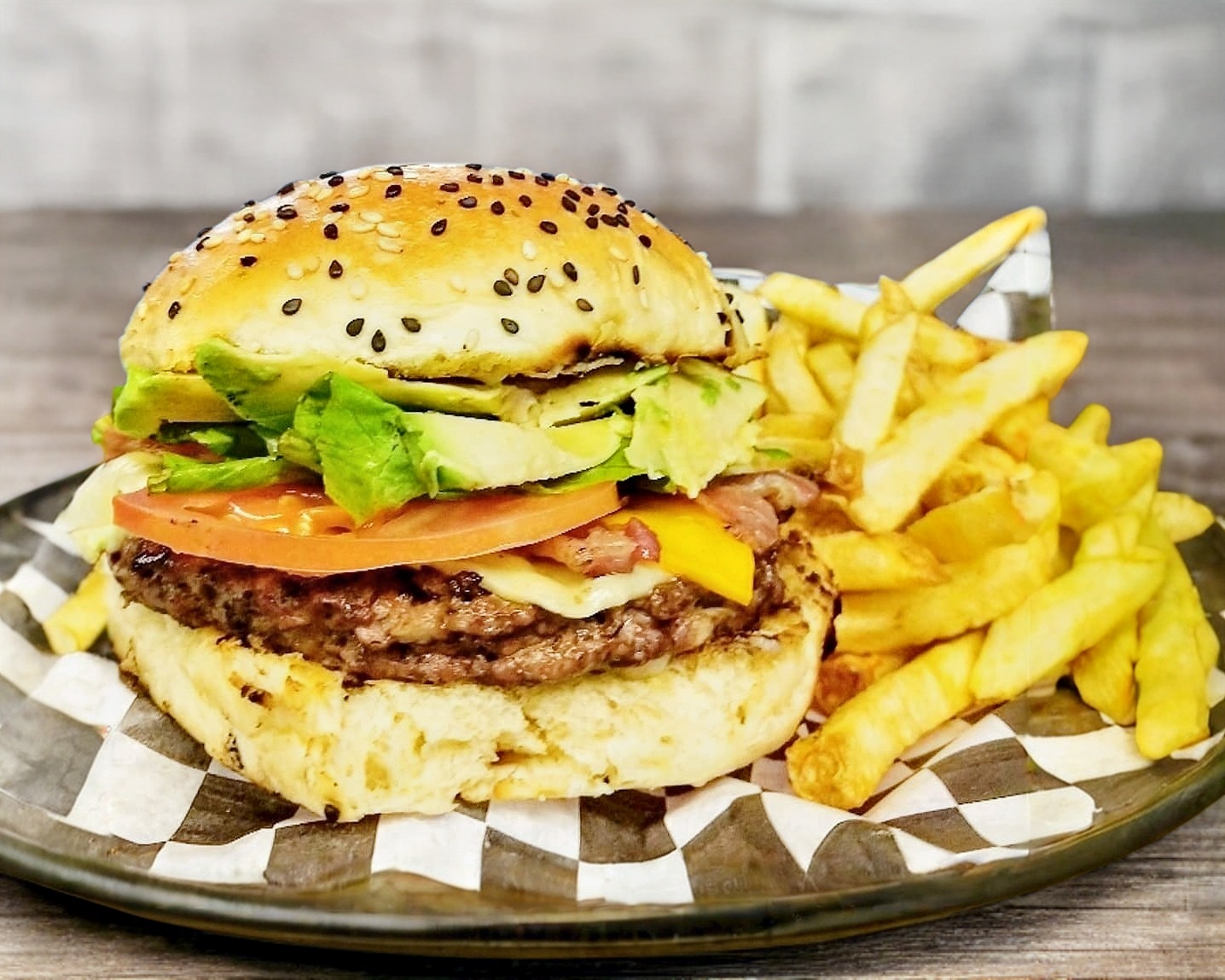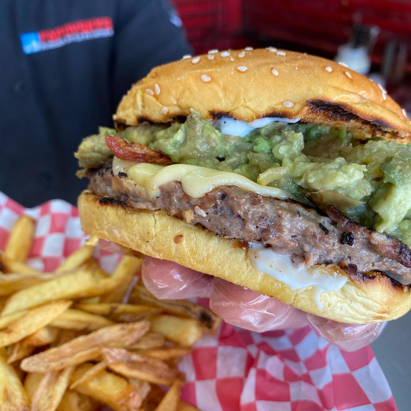 Carne, tocino, aguacate con chile güerito, queso chihuahua. Incluye papas fritas.