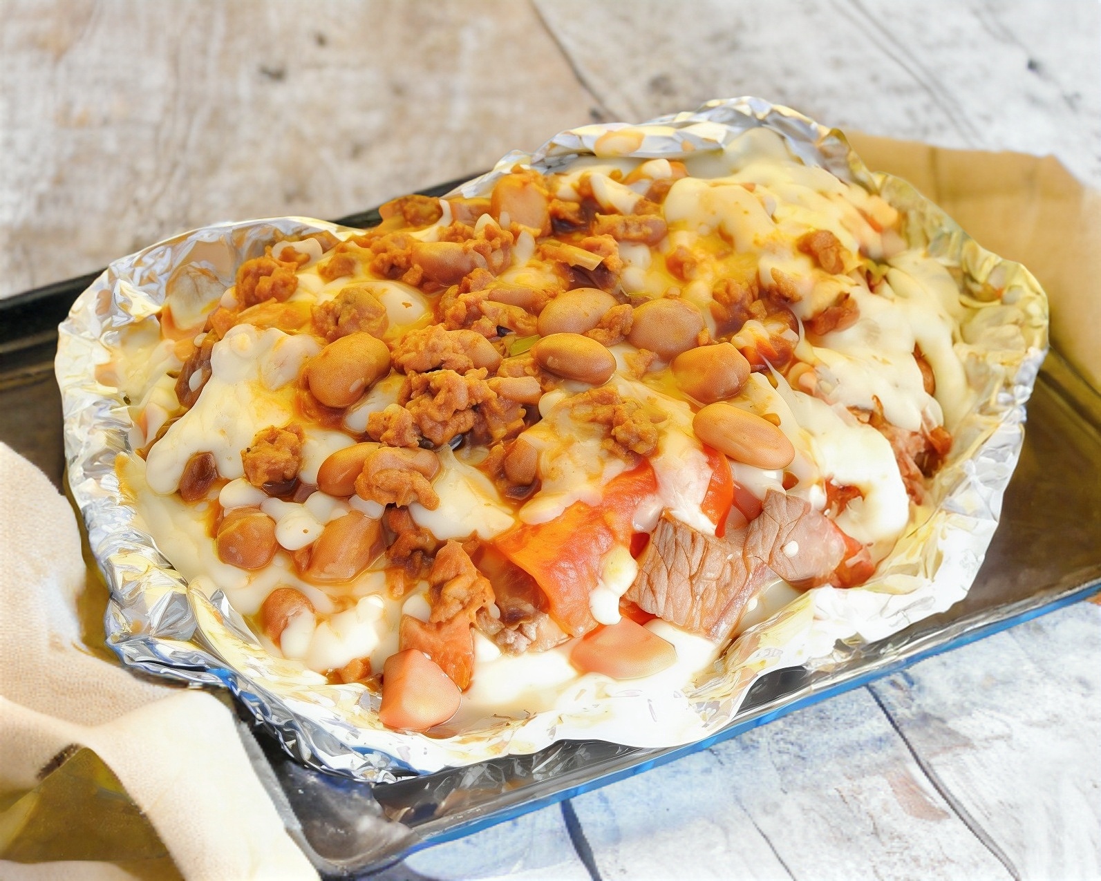 Carne, chilli beans, boneless, tocino, queso amarillo, queso chihuahua, Incluye papas fritas.