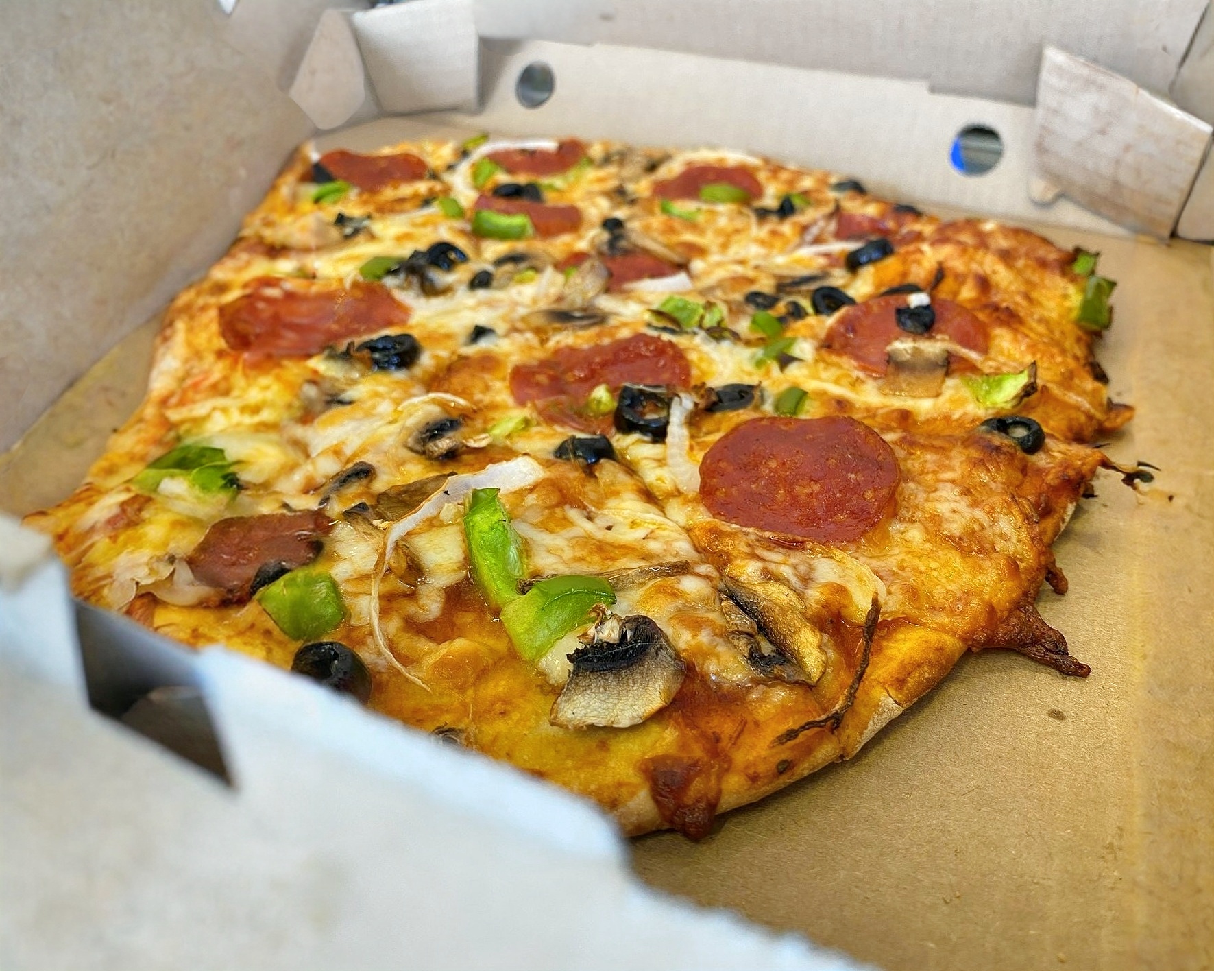 Pepperoni, cebolla blanca, aceituna negra, chile morrón y champiñones. Hecha en una masa delgadita.