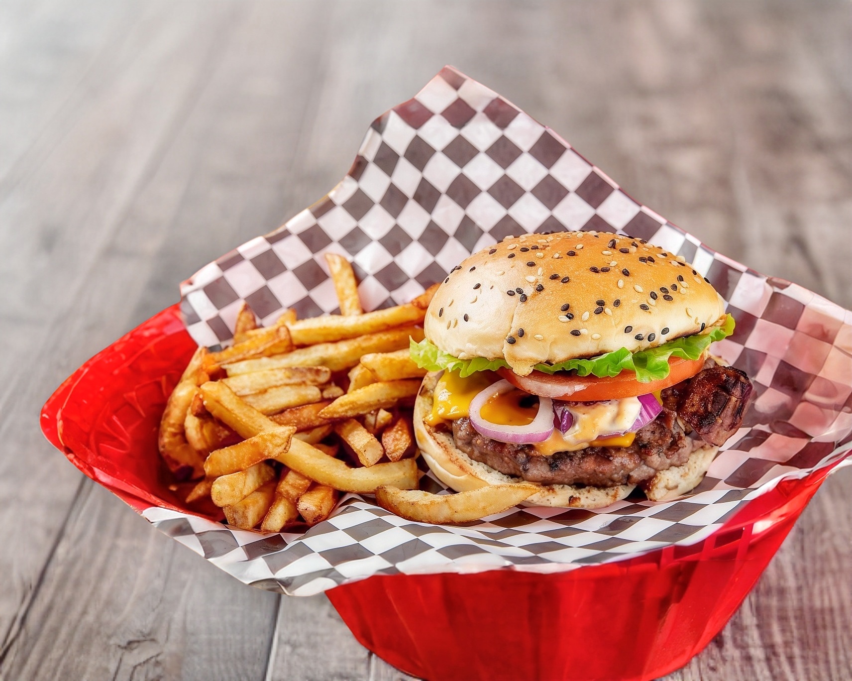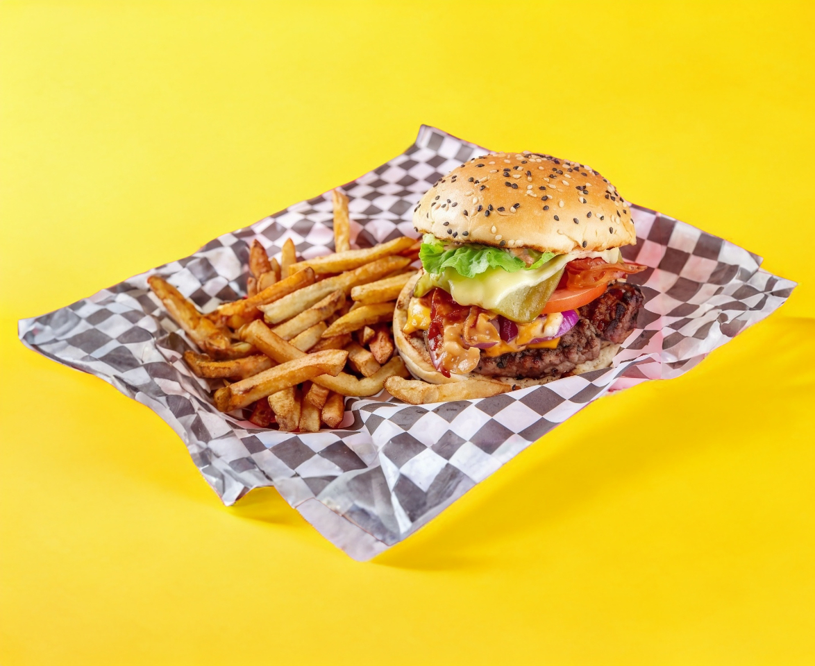 Carne, Lechuga, tomate, cebolla y queso amarillo. Incluye papas fritas.