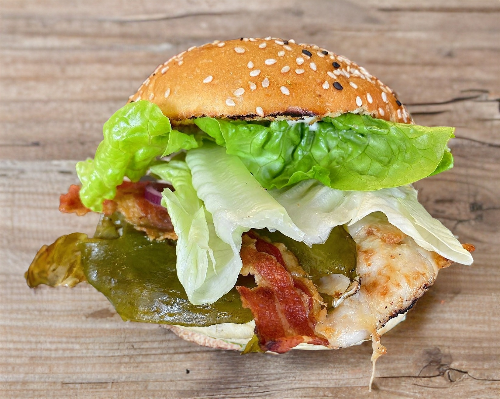 Pechuga de pollo, queso chihuahua, tocino, chile verde y lechuga. incluye papas fritas.