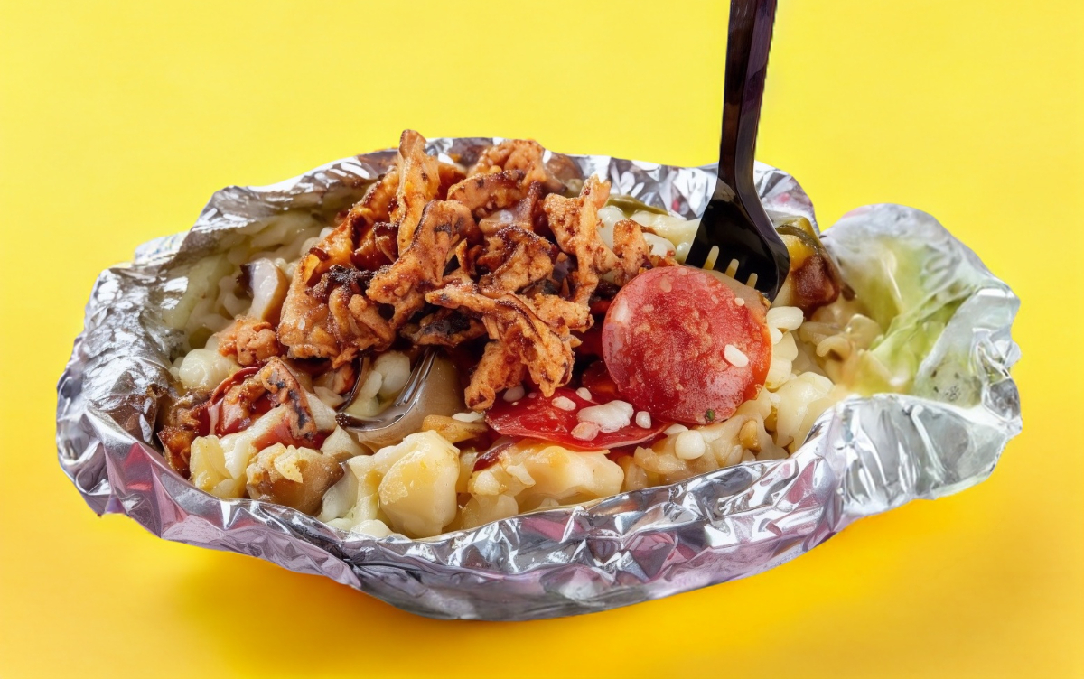 Papa jumbo horneada con mantequilla, queso, carnes frías, carne adobada y cebolla crujiente. Jumbo.