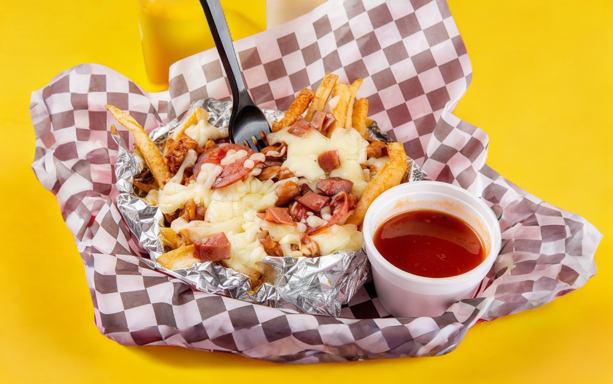 Carne, chilli beans, tocino, queso amarillo y queso chihuahua. Incluye papas fritas.
