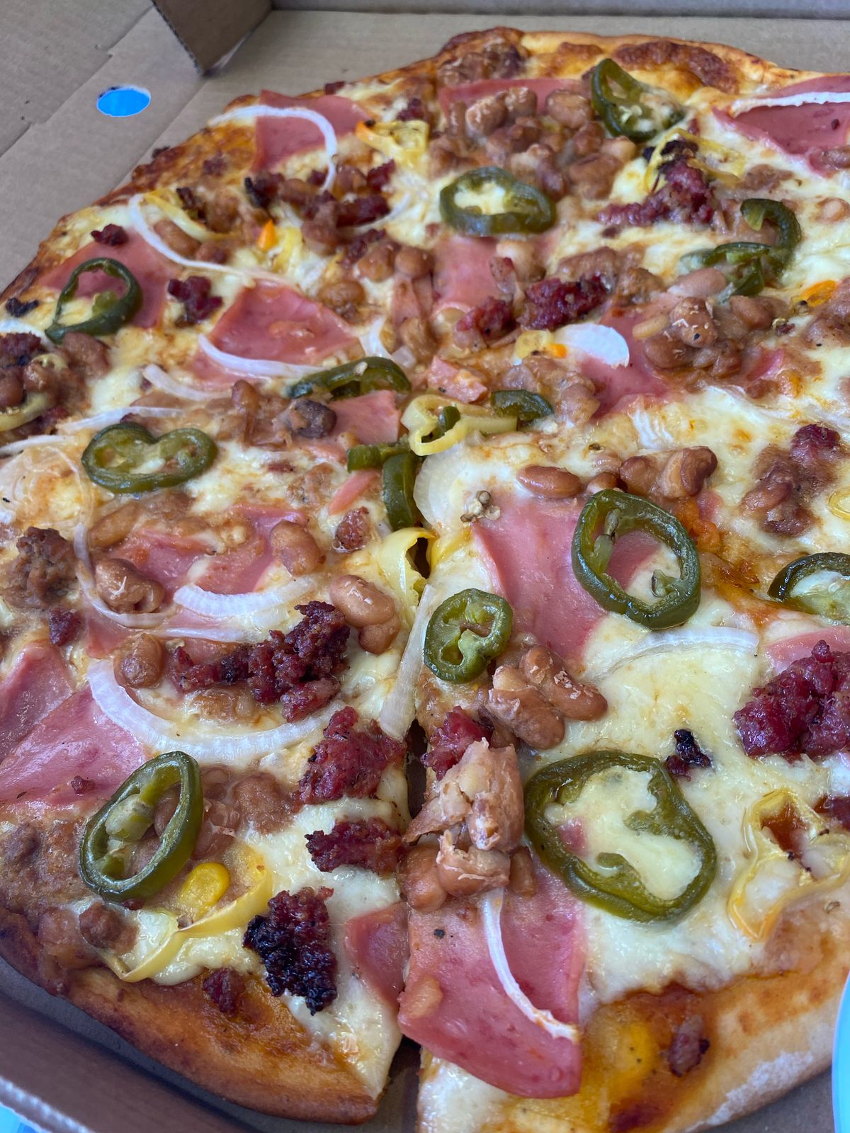 Jamón, tocino, chili beans, cebolla, jalapeños y chile güerito. Hecha en una masa delgadita.