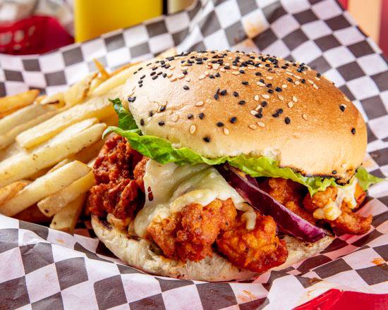 Lechuga, cebolla, queso americano, sin carne, con boneless. Incluye papas fritas.