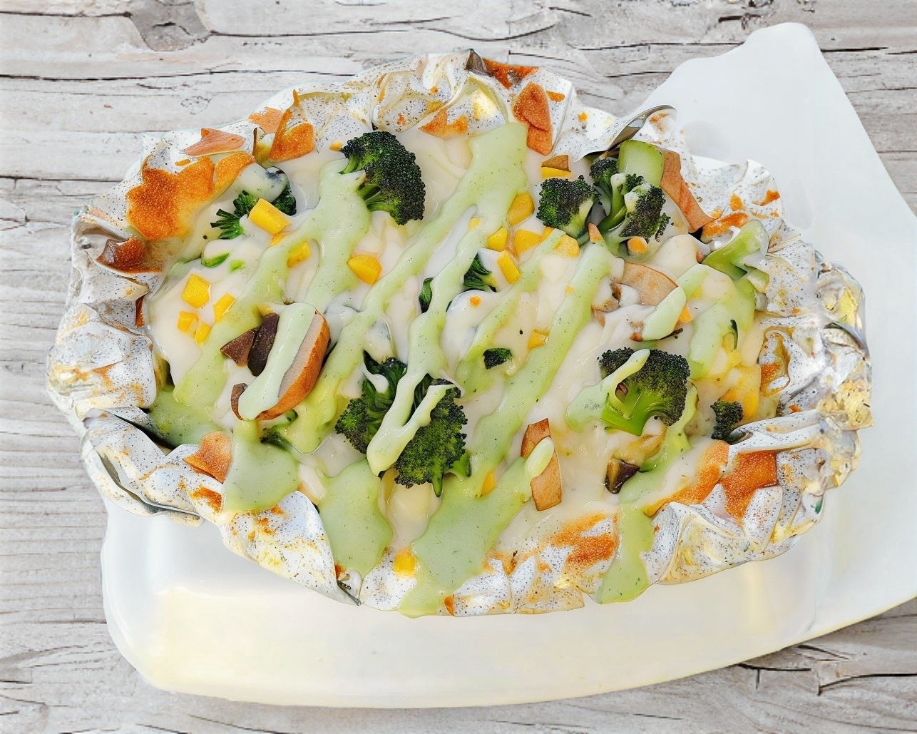 Papa jumbo horneada con mantequilla, queso, brócoli, champiñones y elote. Jumbo.