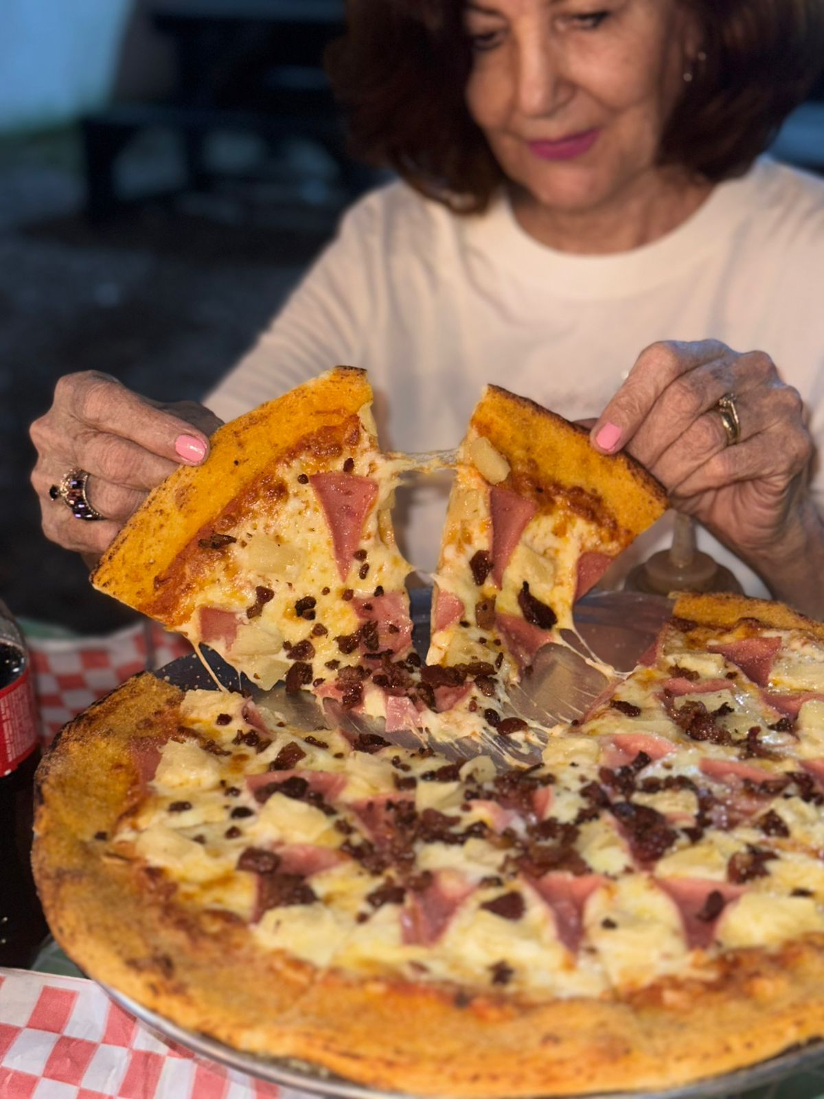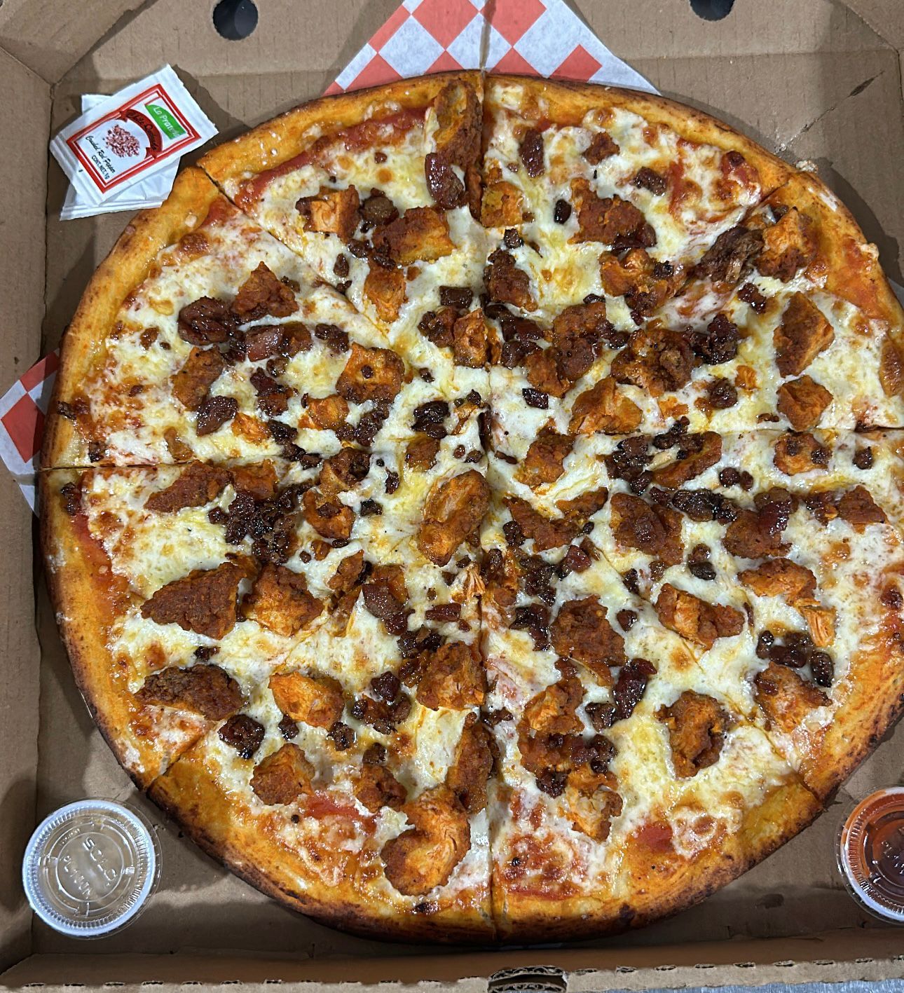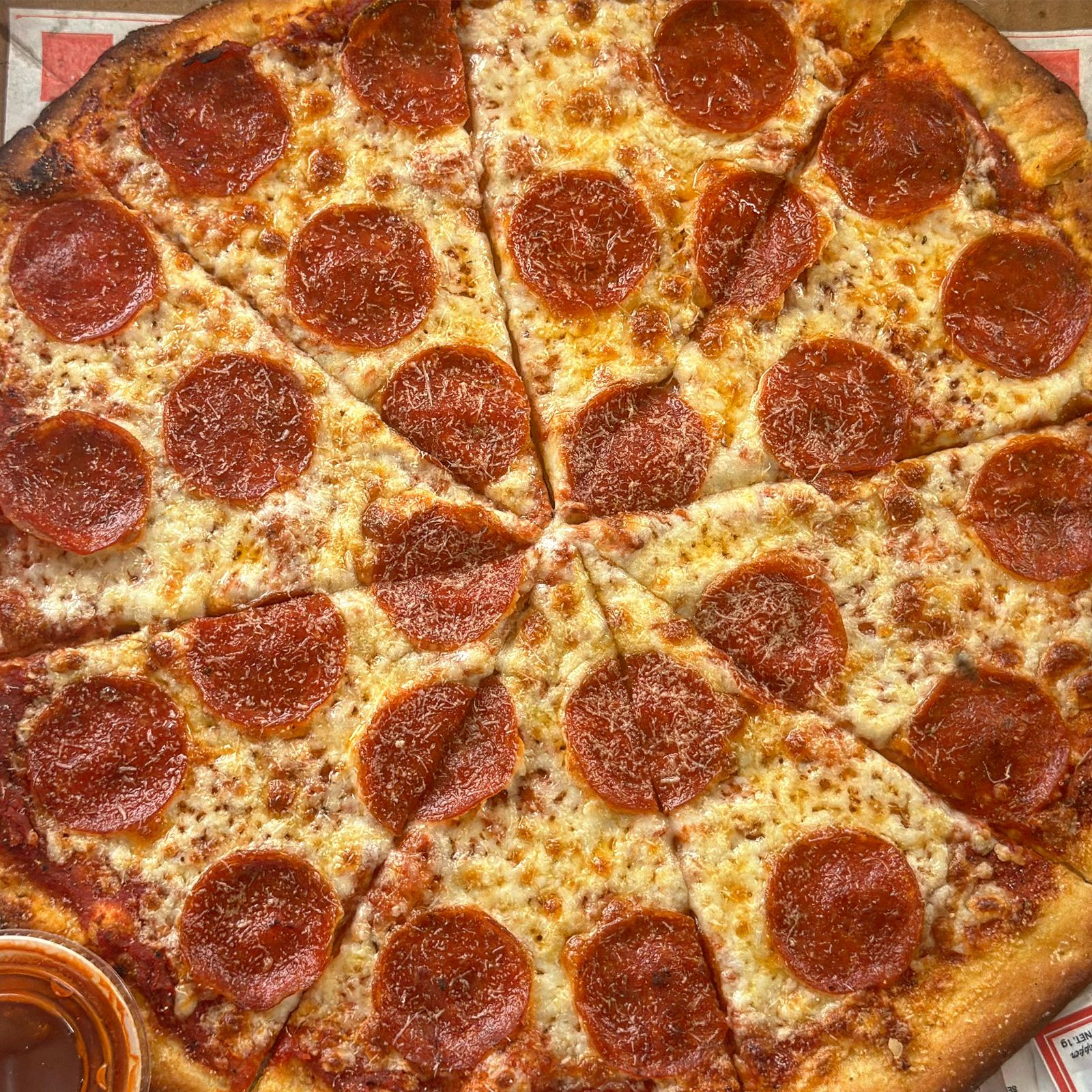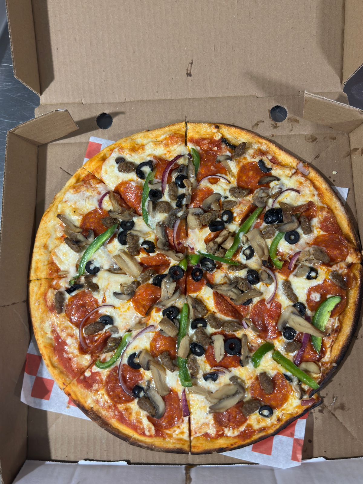 Pepperoni, champiñón, salchicha italiana, aceituna negra, pimiento y cebolla morada.