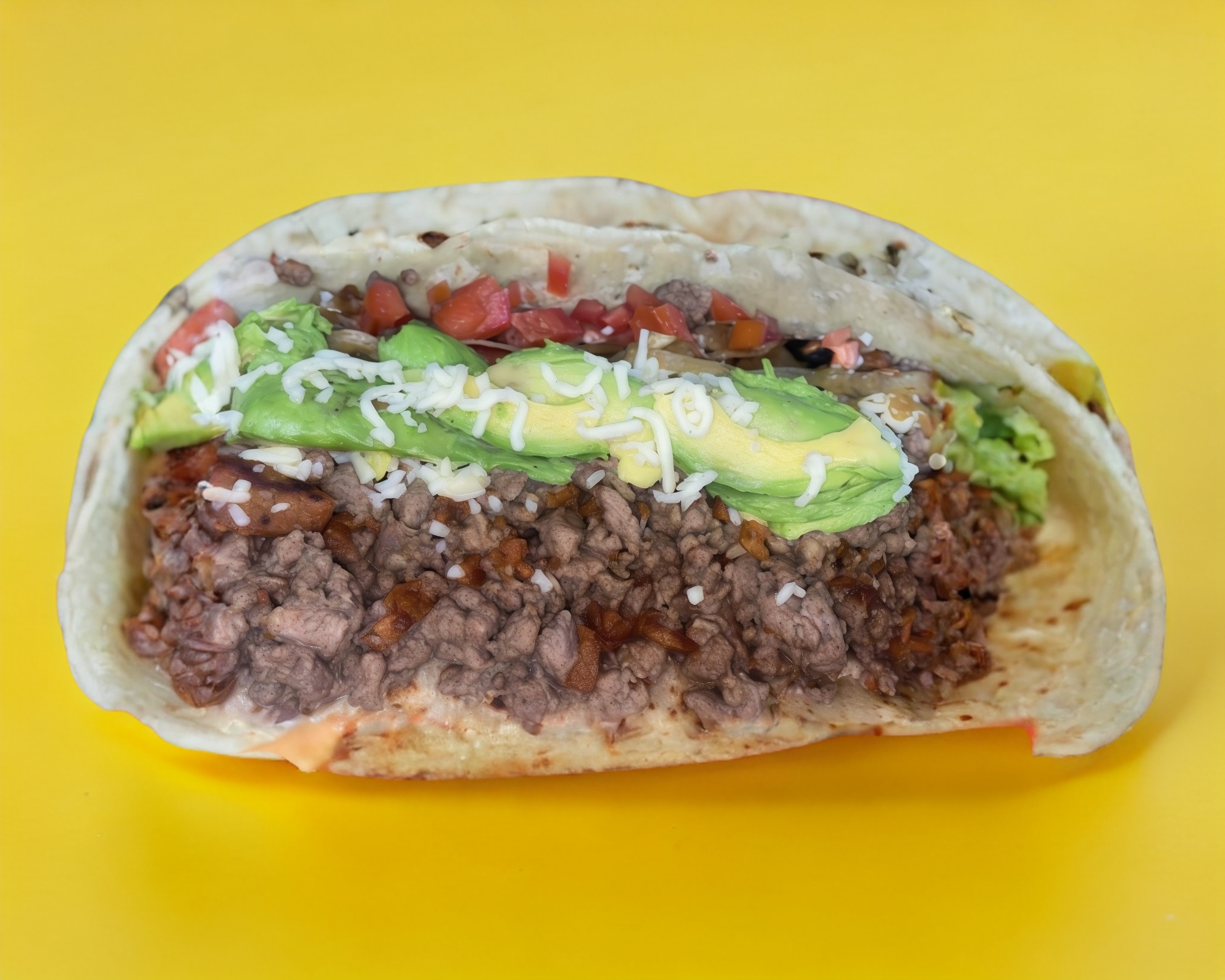 Diezmillo a la plancha, aguacate, tomate, cebolla, queso chihuahua, queso mozzarella y queso crema.