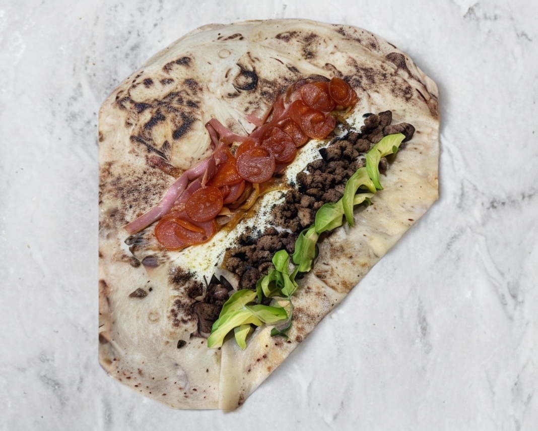 Carne, aguacate, queso, mayonesa, tomate, cebolla asada, pepperoni y jamón.