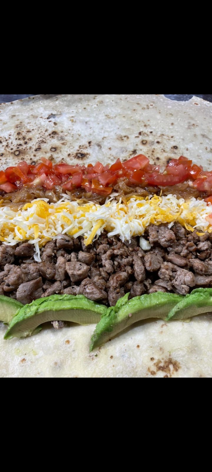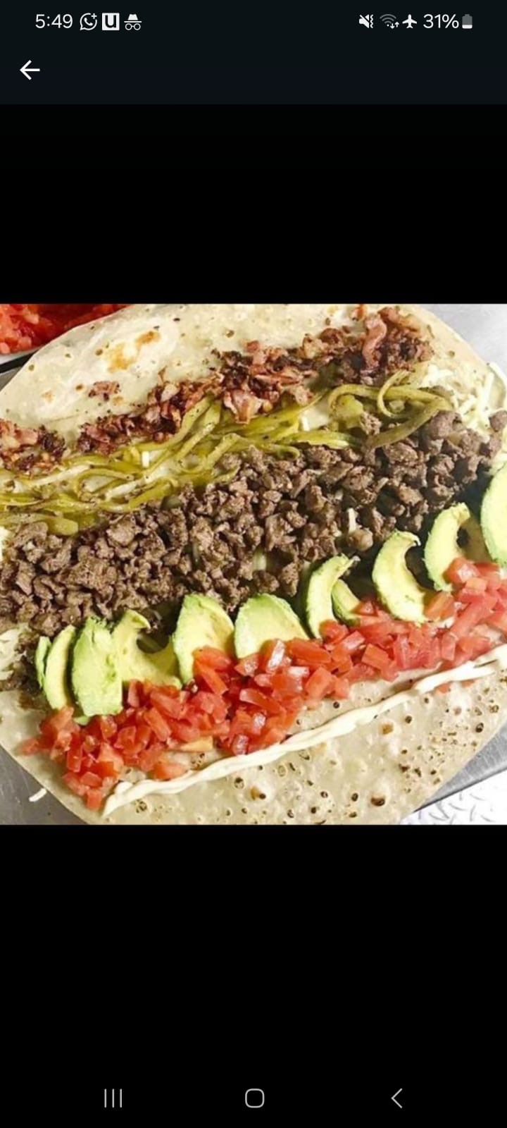 Burro Entero. Con Carne, aguacate, queso, tomate, mayonesa, tocino, cebolla y chile verde asado.