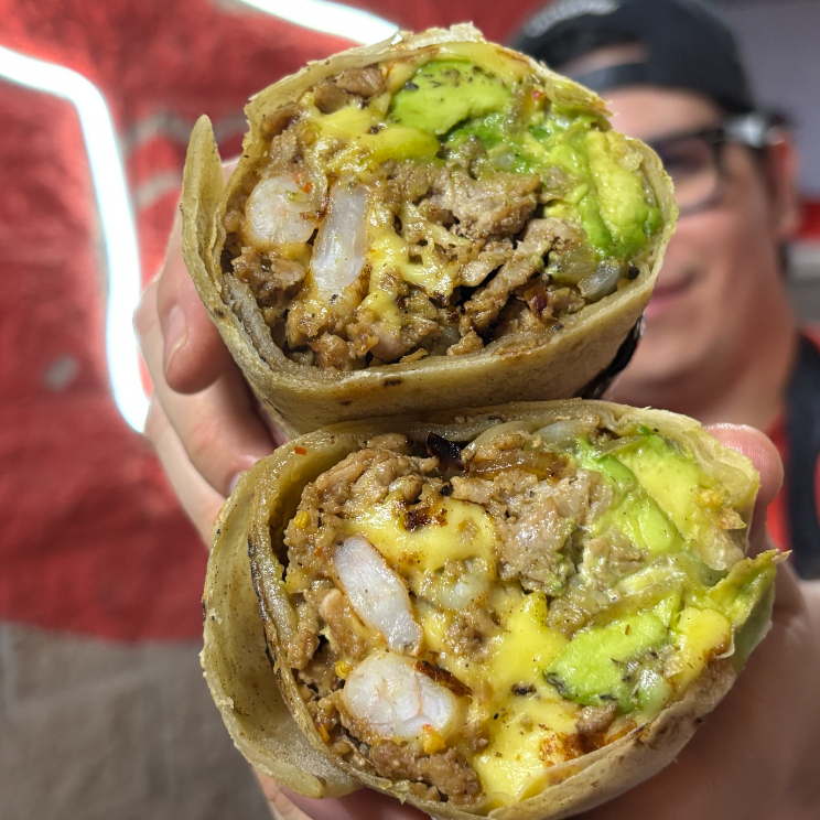 Carne a la plancha, camarones bañados en mantequilla de ajo y chiltepin, costra de queso por dentro, Philadelphia, cebolla asada, aguacate y aderezo de ajo