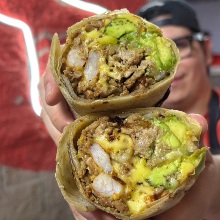 Carne a la plancha, camarones bañados en mantequilla de ajo y chiltepin, costra de queso por dentro, philadelphia, cebolla asada, aguacate y aderezo de ajo