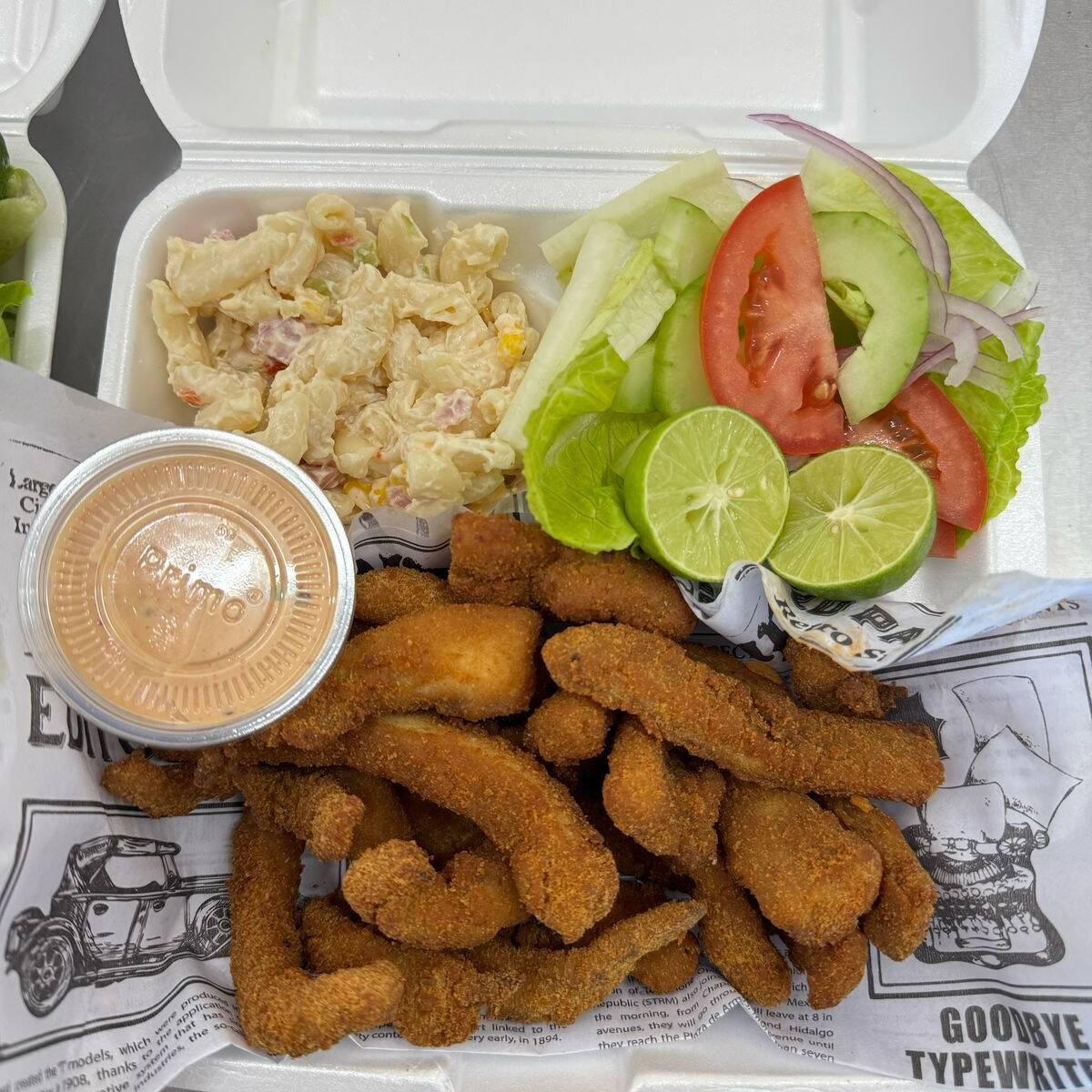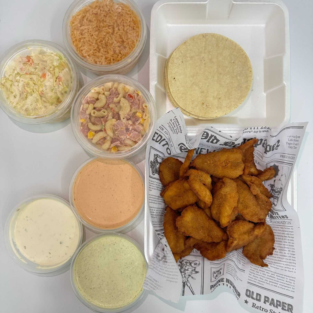 1 kg Deditos de pescado, 1 complemento (sopa fría, sopa de arroz o ensalada chipilona), 1 aderezo (chipotle, tártara o jalapeño-cilantro), 1/2 kg. de tortillas de maíz.