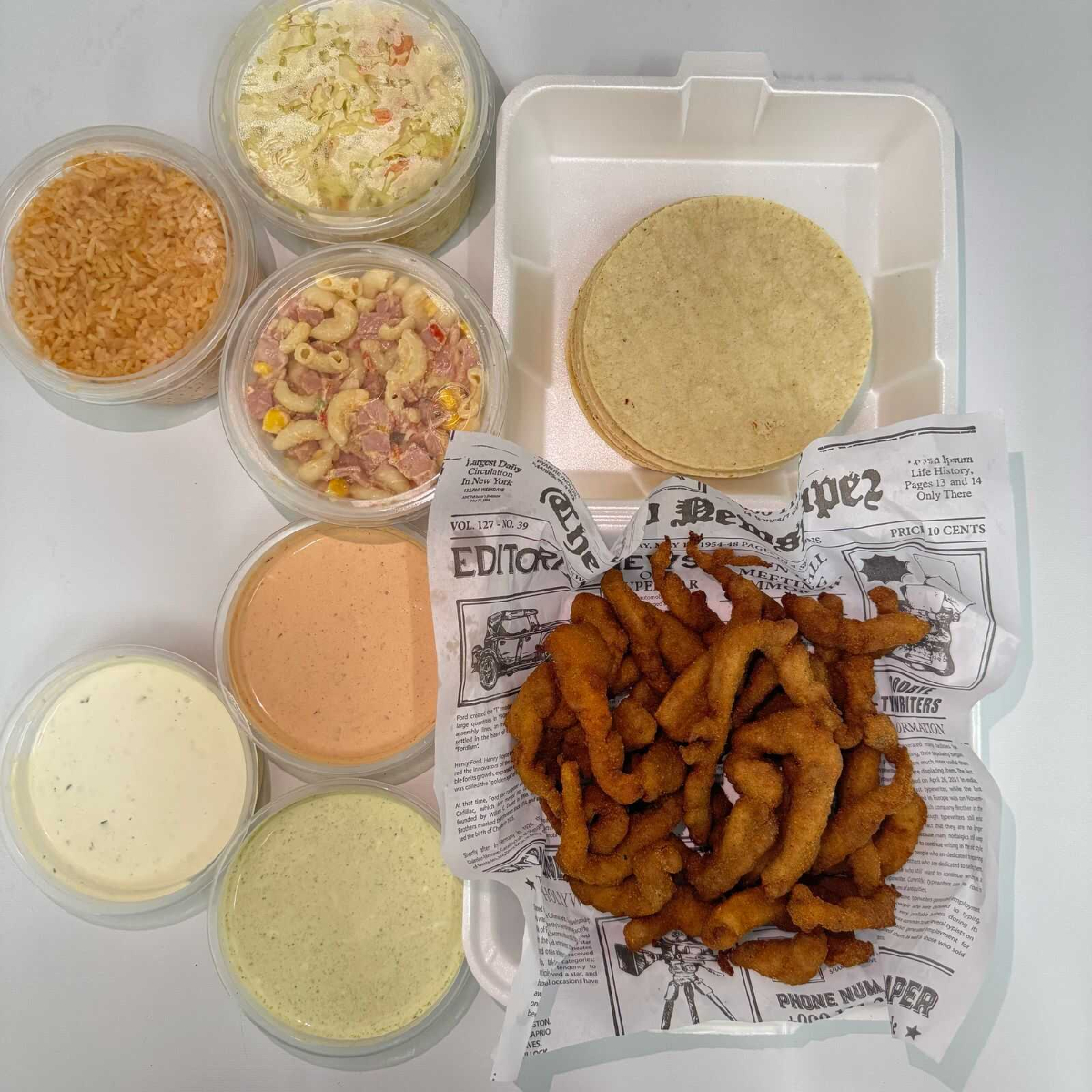 1/2 kg Deditos de pescado y 1/2 kg. camarón empanizado, 1 complemento (sopa fría, sopa de arroz o ensalada chipilona), 1 aderezo (chipotle, tártara o jalapeño-cilantro), 1/2 kg. de tortillas de maíz.