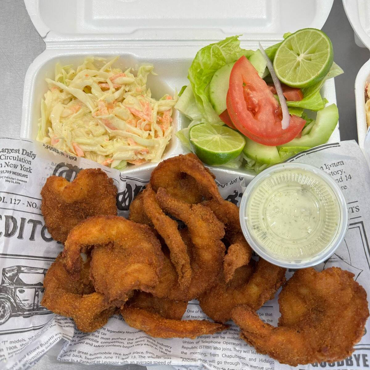 250 g Camarón empanizado, 2 complementos (sopa fría, sopa de arroz o ensalada chipilona), 1 aderezo (chipotle, tártara o jalapeño-cilantro), tortillas de maíz y cubiertos.
