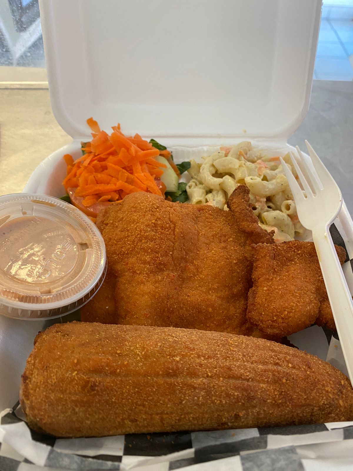 250gr pescado frito, ensalada fresca, sopa fría, aderezo y tortilla.