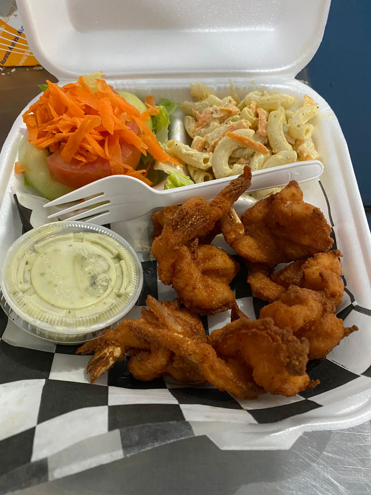 150 gr de camarones fritos, sopa y/o arroz, ensalada fresca, tortillas y arroz.