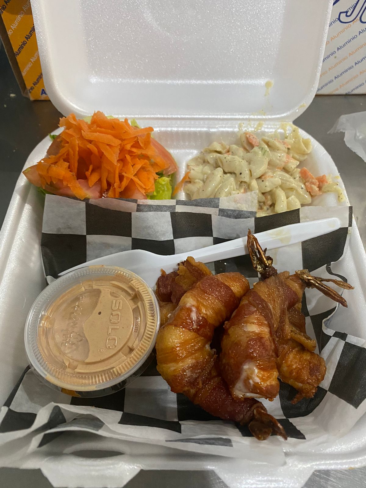 175 gr de camarones rellenos, ensalada fresca, sopa/ arroz, aderezo y tortilla.