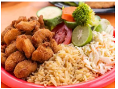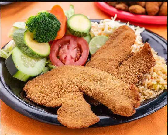 1 Kg. de pescado empanizado, 1 lt. de arroz, ensalada, salsa, 400 gr. de tortillas.