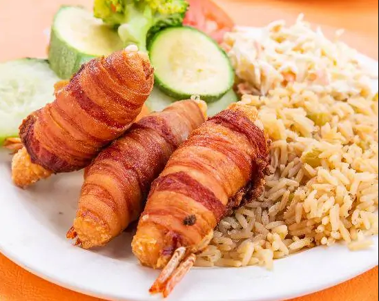 Camarón relleno de queso, enrollado en tocino, arroz y ensalada.