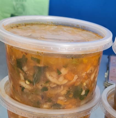 250 g De camarón lleva sopa fria y ensalada con aderezo, y 5 tortillas de maíz.