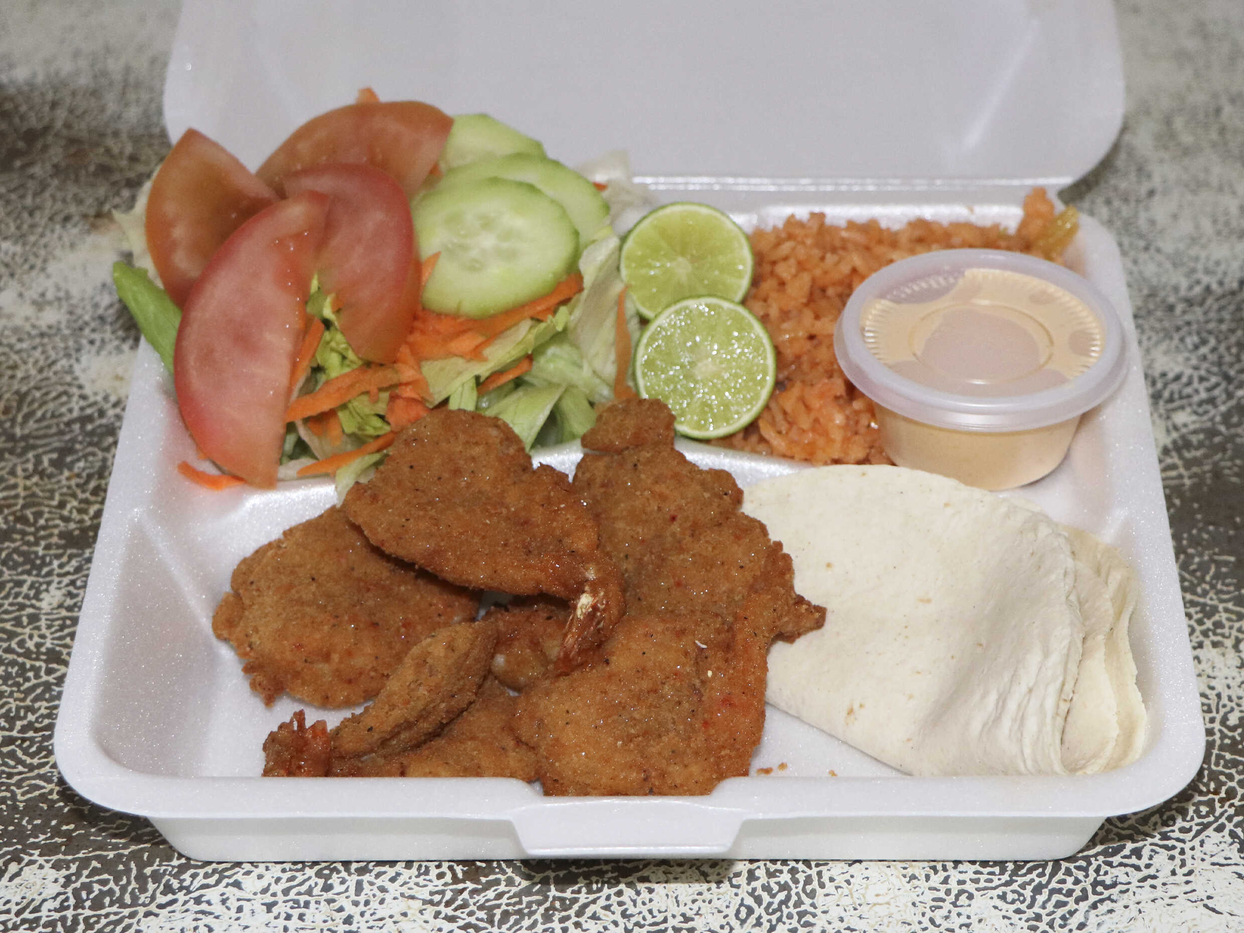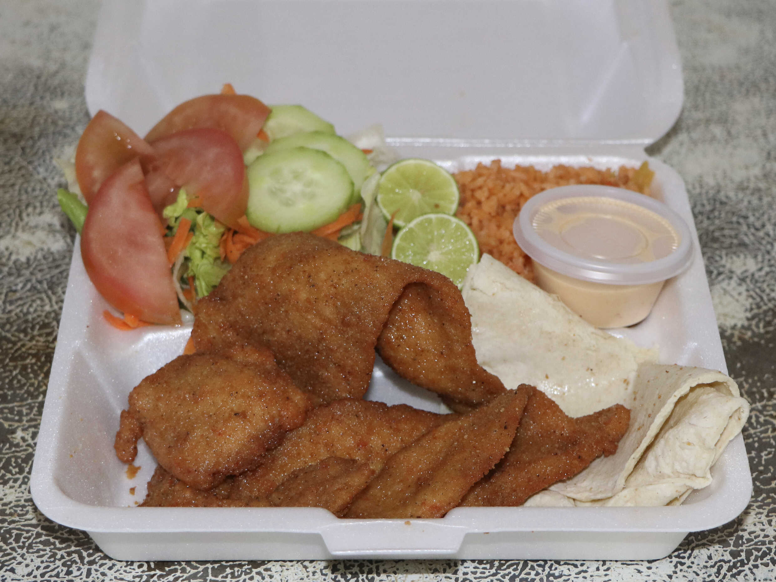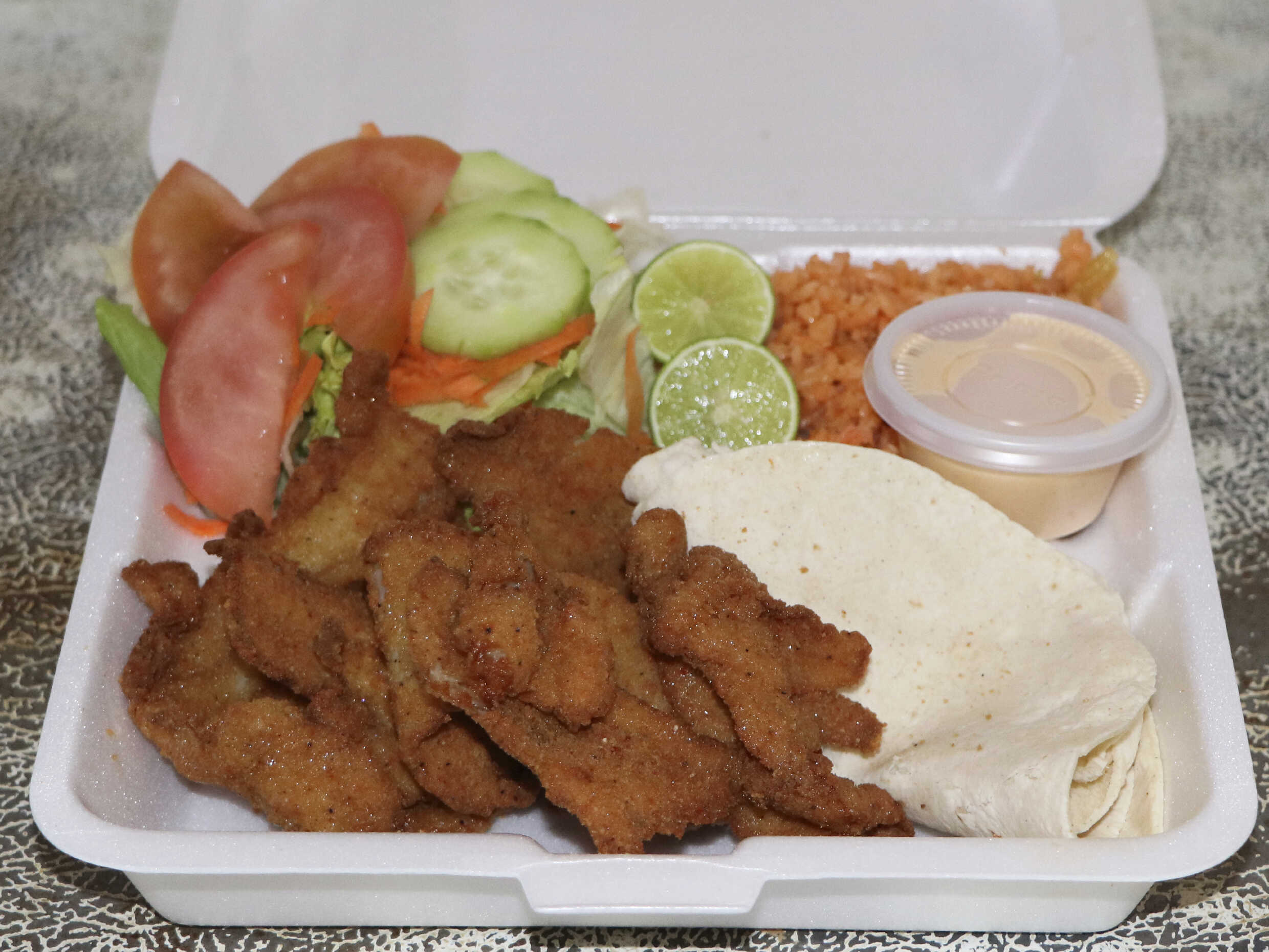 Pescado empanizado (1kg), arroz (1/2lt)ensalada chipilona (1/2 lt), aderezo y tortillas.