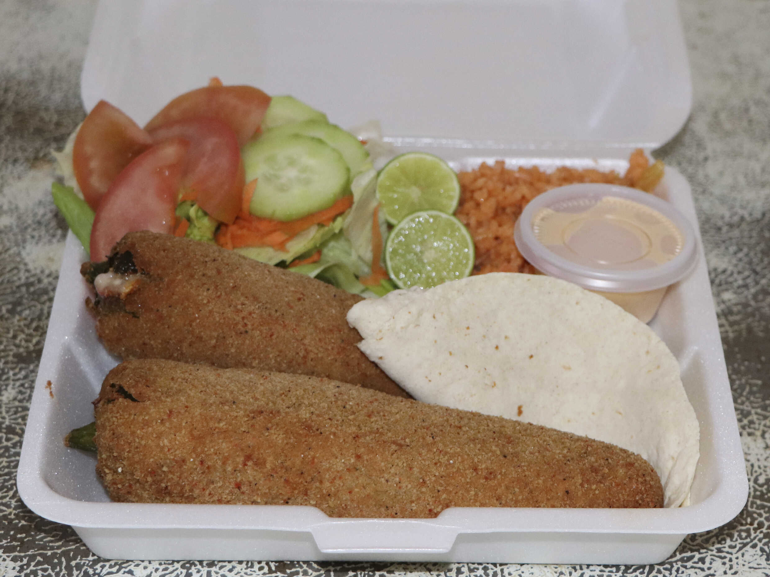 2 Piezas chile relleno de marlín (atún ahumado) y queso chihuahua, arroz, ensalada verde, aderezo y tortillas.
