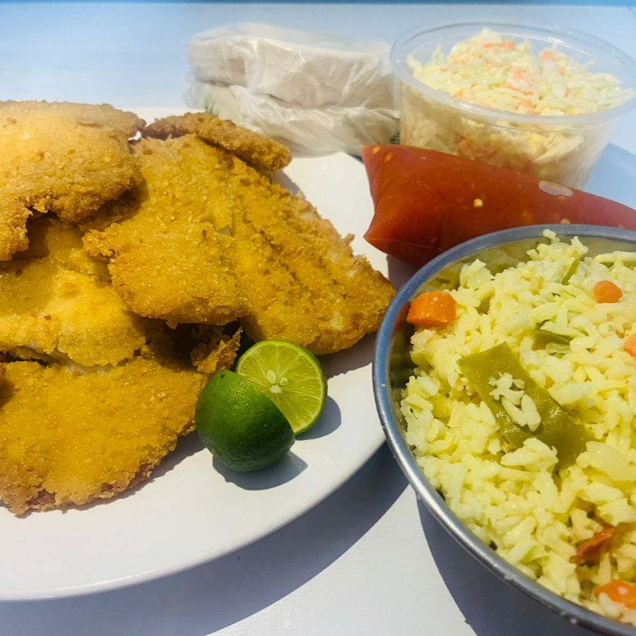 Porción individual de pescado empanizado dorado al momento, acompañado de chipilona, arroz y tortillas, camarón empanizado estilo casero en porción individual, acompañados de chipilona, arroz y tortillas. incluye refresco.