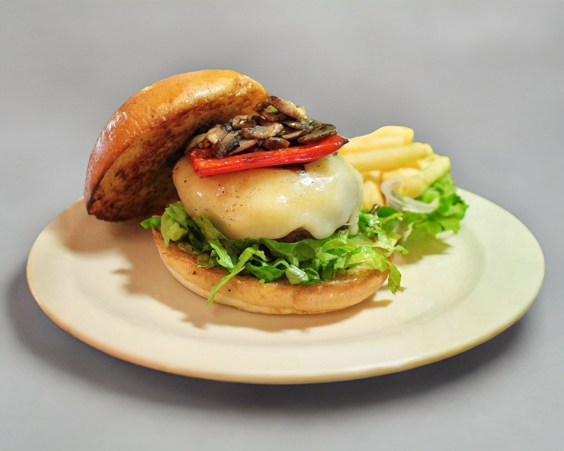 180 gr de carne de res, espinacas, champiñones salteados, pimiento morrón y queso suizo