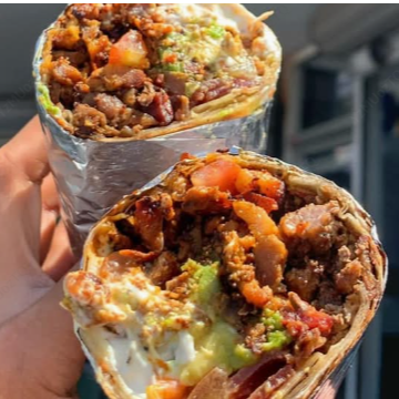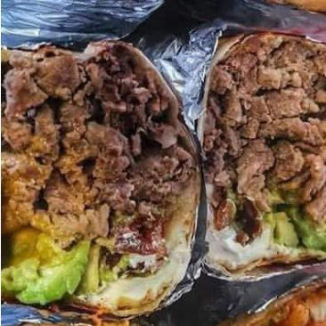Burro grande. Carne, queso crema, tocino, aguacate y tomate.
