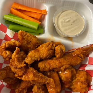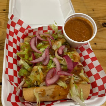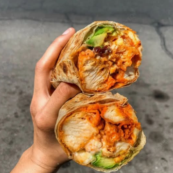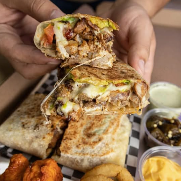 Burro grande. Boneless buffalo, queso, queso crema, queso cheddar, tocino y aguacate.