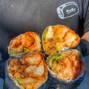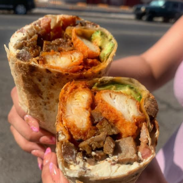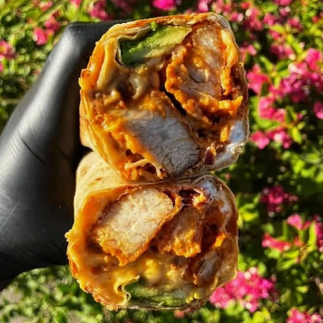 Burro grande. Carne, boneless buffalo, queso crema, tocino y aguacate.