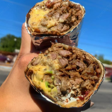Burro grande. Carne, queso, tomate, aguacate, tocino, chile verde y cebolla asada.