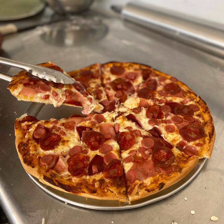 Jamón, salami, pepperoni, salchicha, cebolla, pimiento verde, elote, champiñón y aceituna. 14.