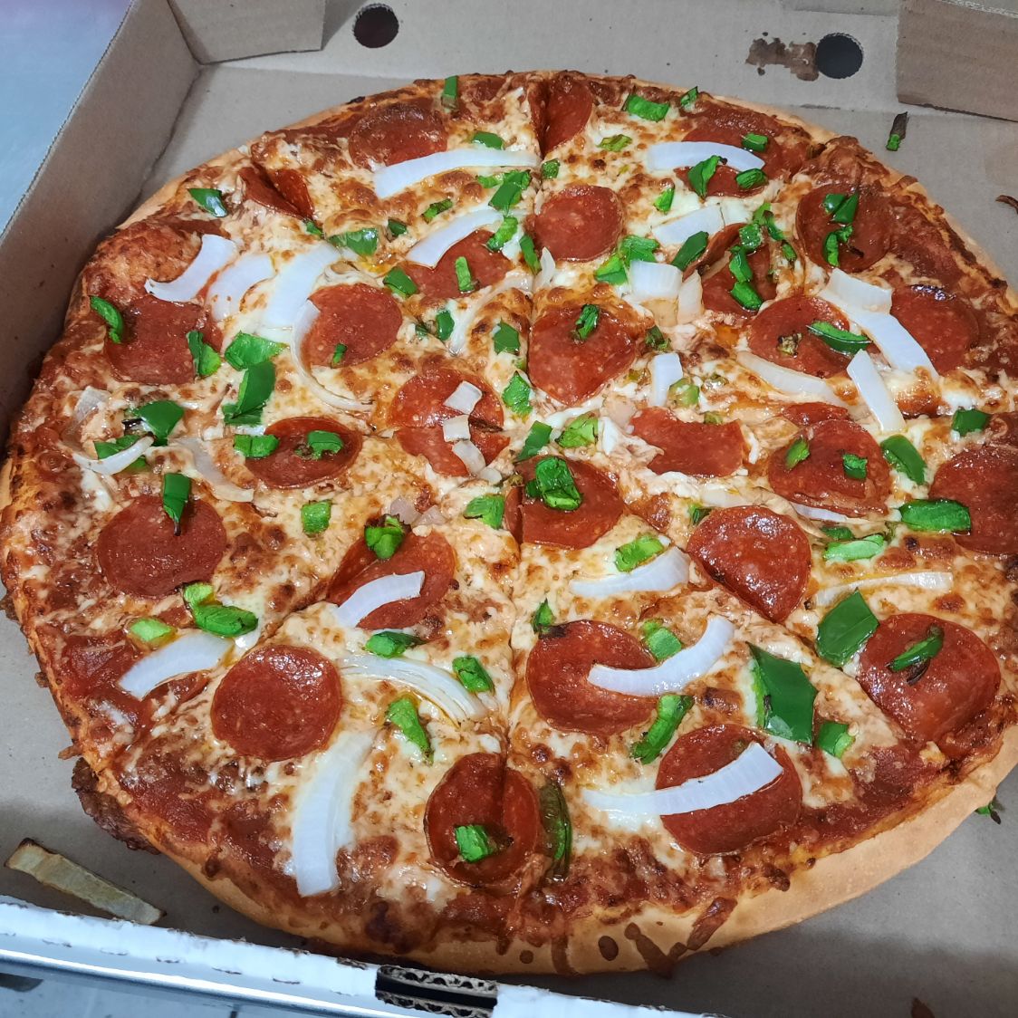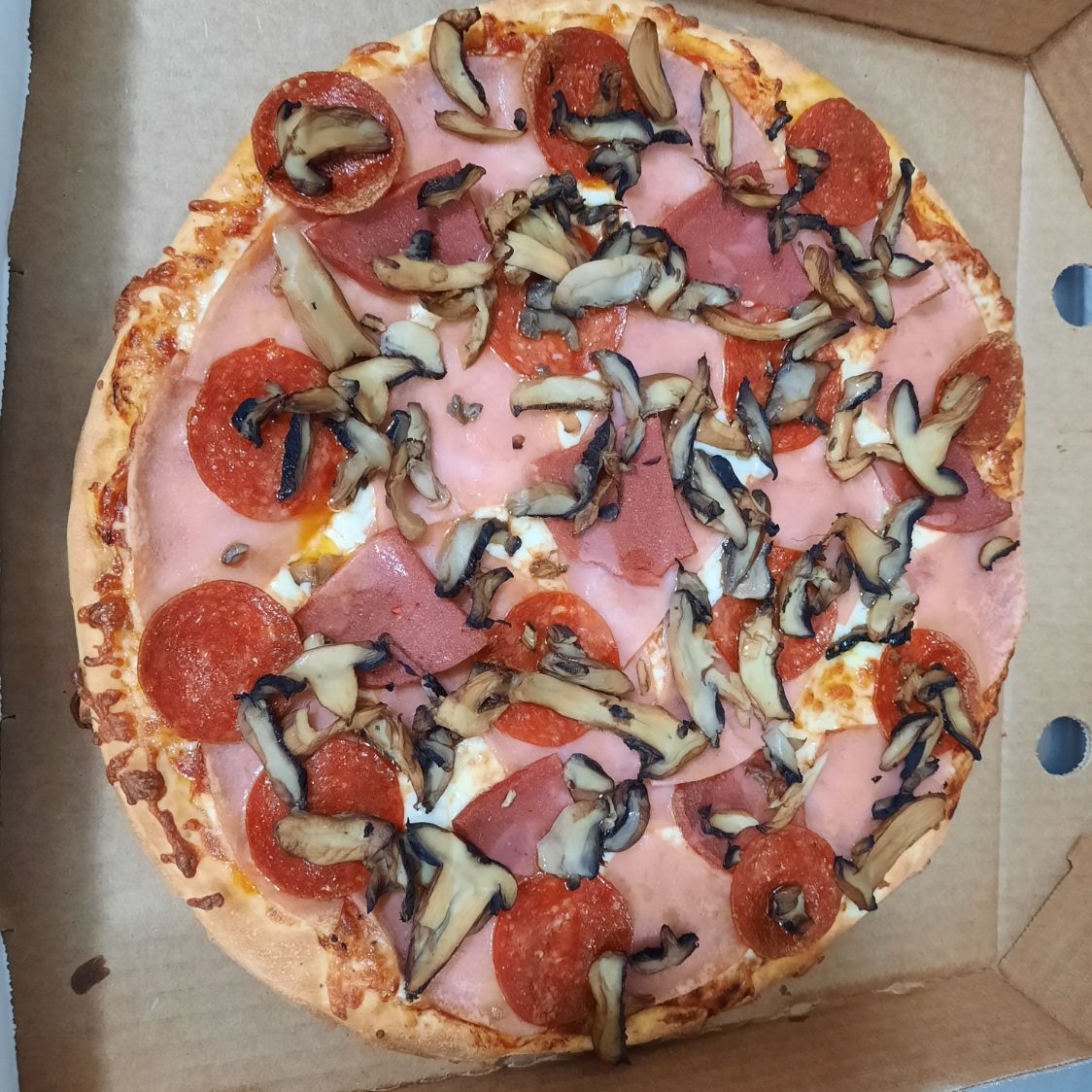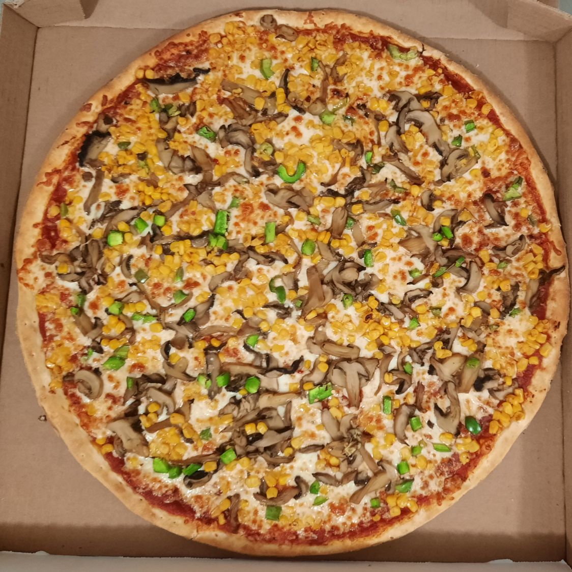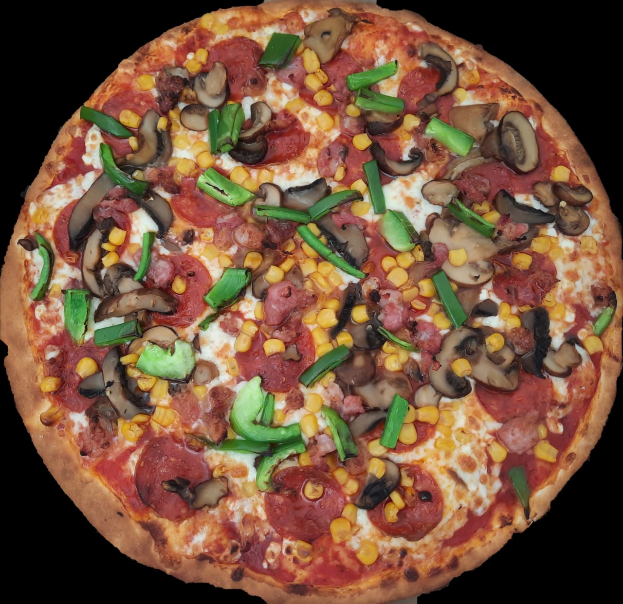 Peperoni, champiñones, elote, pimiento verde, tocino.