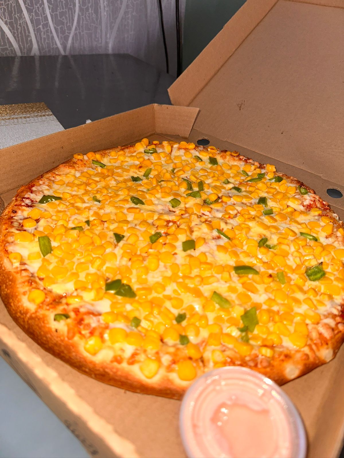 Pizza Grande de Champiñon, elote, pimiento verde y aceituna negra