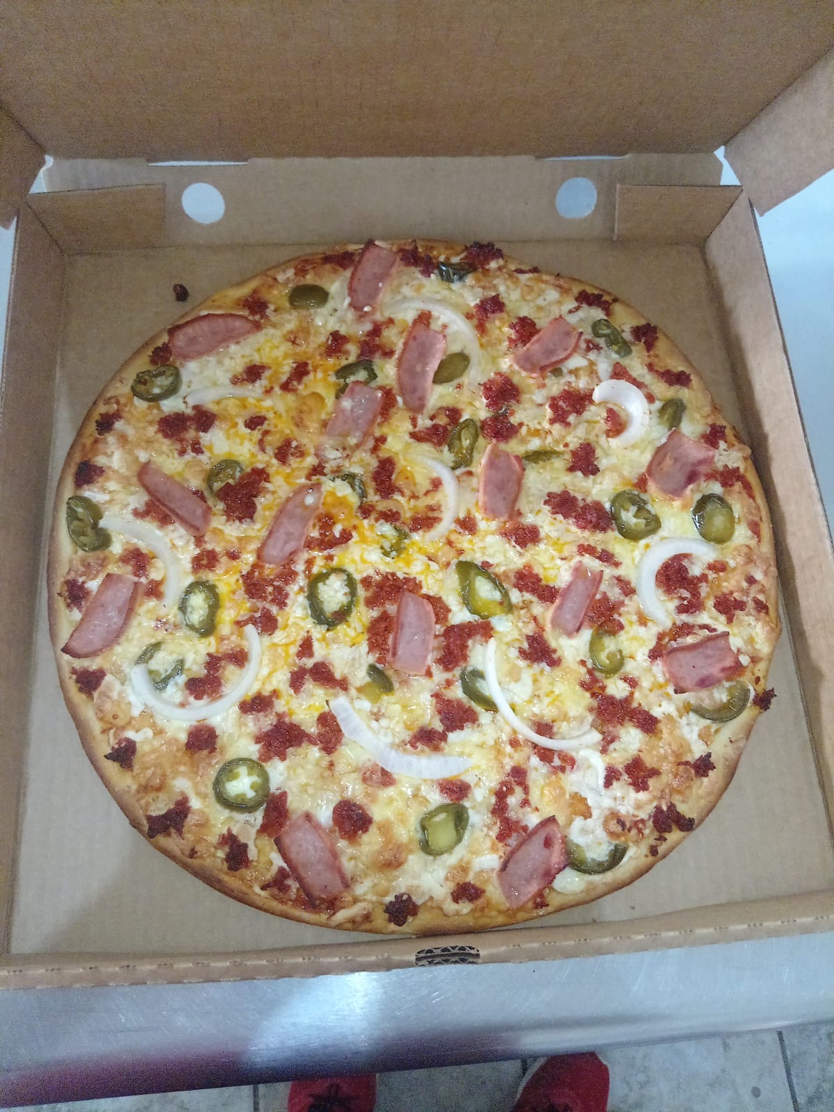 Pizza Grande de Chorizo, jalapeño, tocino y cebolla